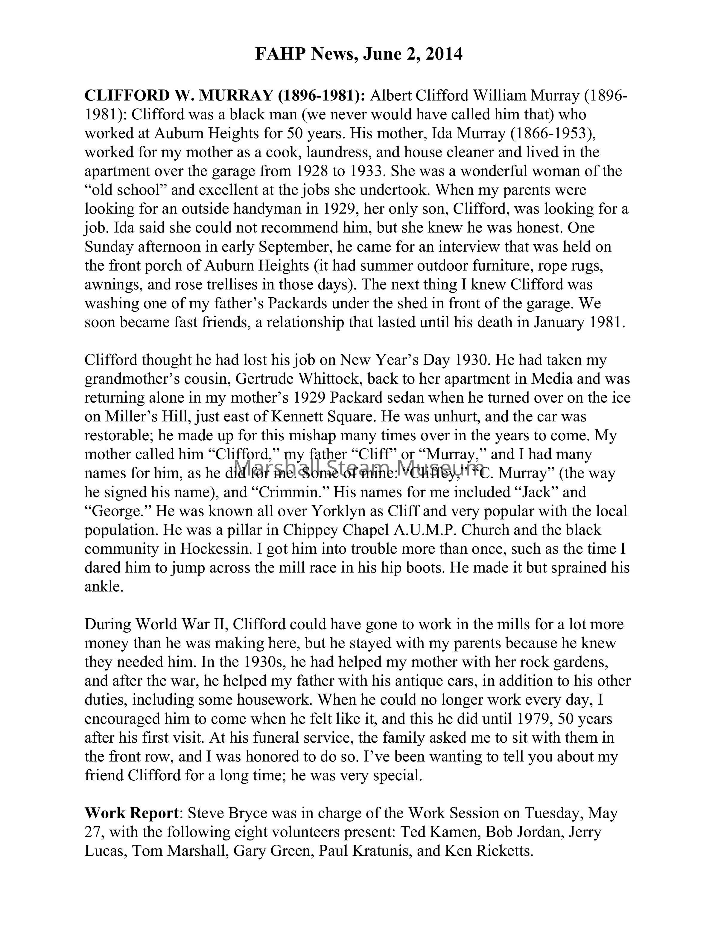 CLIFFORD W. MURRAY (1896-1981): Albert Clifford William Murray (1896-1981): Clifford was a black man (we never would have called him that) who worked at Auburn Heights for 50 years. His mother, Ida Murray (1866-1953), worked for my mother as a cook, laundress, and house cleaner and lived in the apartment over the garage from 1928 to 1933. She was a wonderful woman of the “old school” and excellent at the jobs she undertook. When my parents were looking for an outside handyman in 1929, her only son, Clifford, was looking for a job. Ida said she could not recommend him, but she knew he was honest. One Sunday afternoon in early September, he came for an interview that was held on the front porch of Auburn Heights (it had summer outdoor furniture, rope rugs, awnings, and rose trellises in those days). The next thing I knew Clifford was washing one of my father’s Packards under the shed in front of the garage. We soon became fast friends, a relationship that lasted until his death in January 1981.
