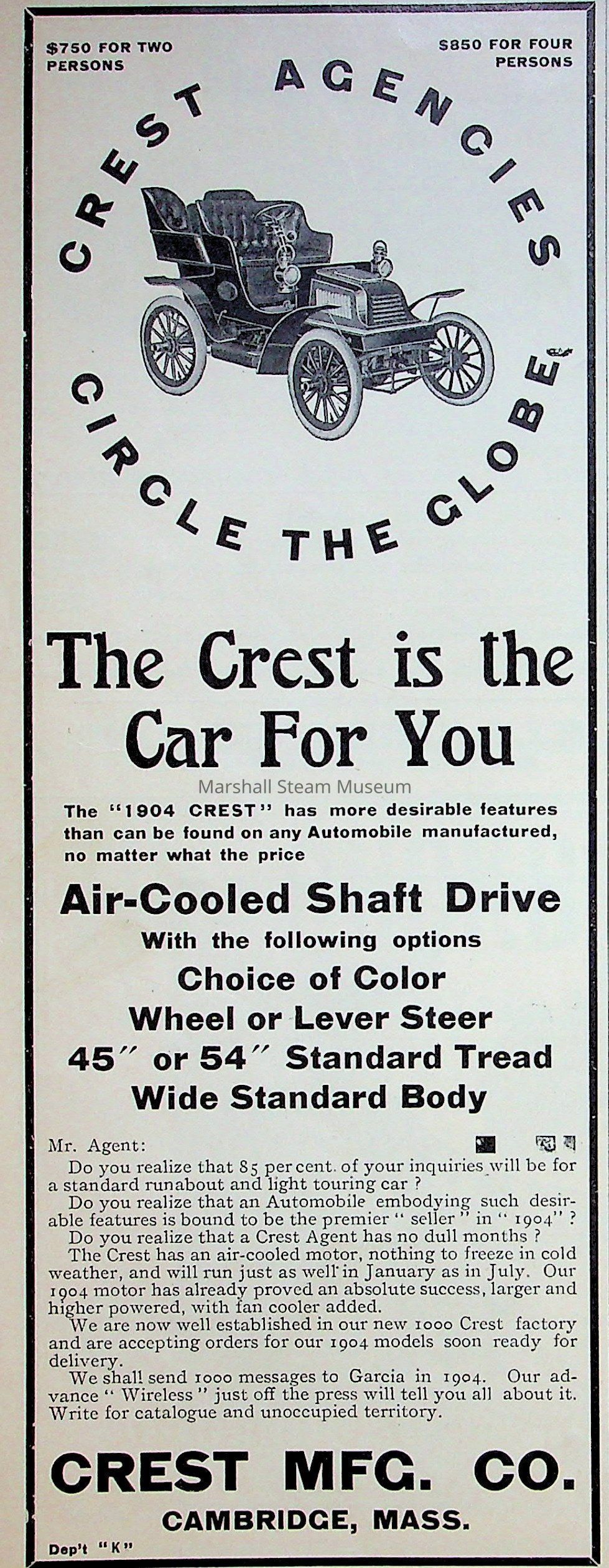 1903 advertisement for Crest Manufacturing scanned excerpt from December, 1903, issue of "The Automobile" magazine