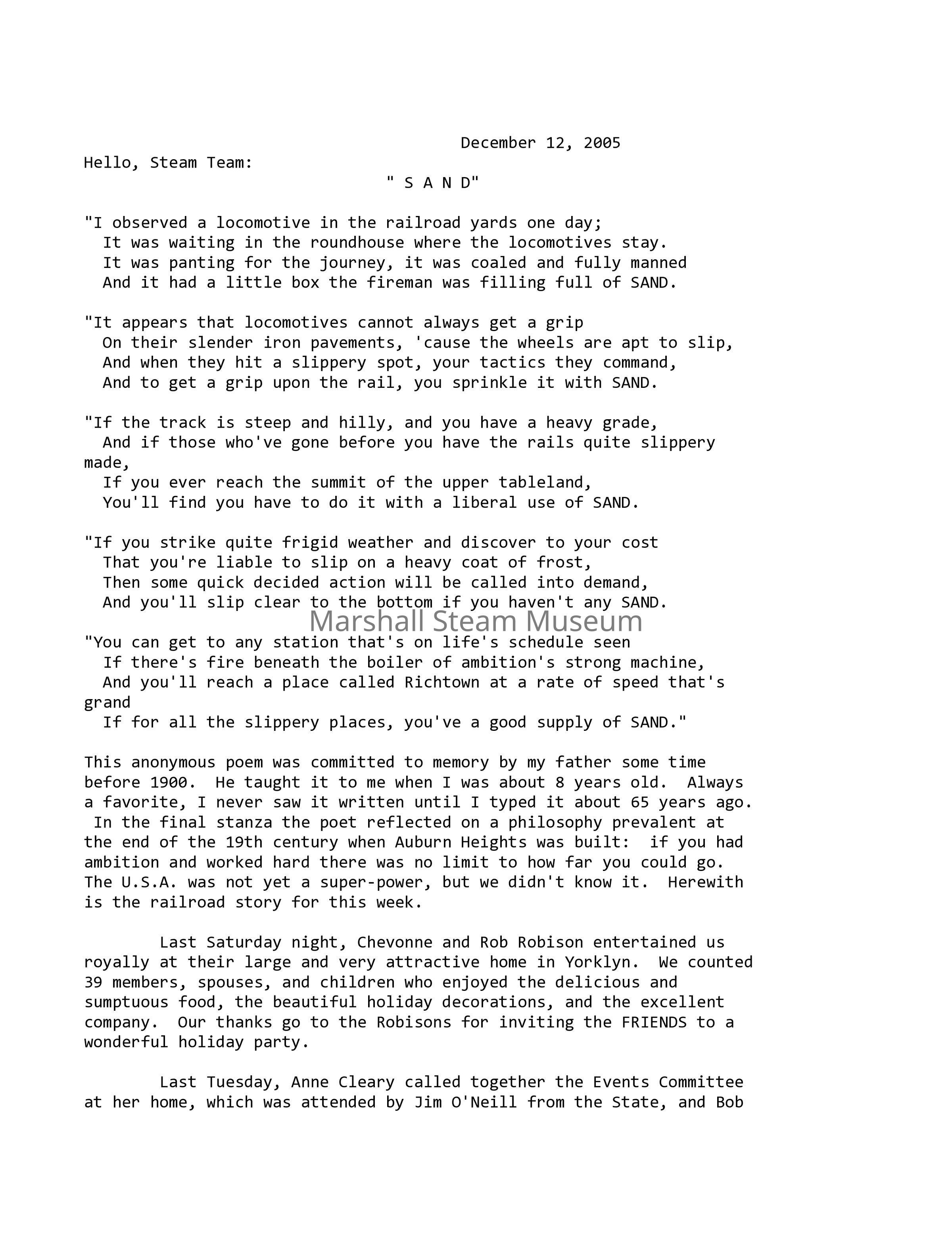 This anonymous poem was committed to memory by my father some time before 1900. He taught it to me when I was about 8 years old. Always a favorite, I never saw it written until I typed it about 65 years ago. In the final stanza the poet reflected on a philosophy prevalent at the end of the 19th century when Auburn Heights was built: if you had ambition and worked hard there was no limit to how far you could go. The U.S.A. was not yet a super-power, but we didn't know it. Herewith is the railroad story for this week.