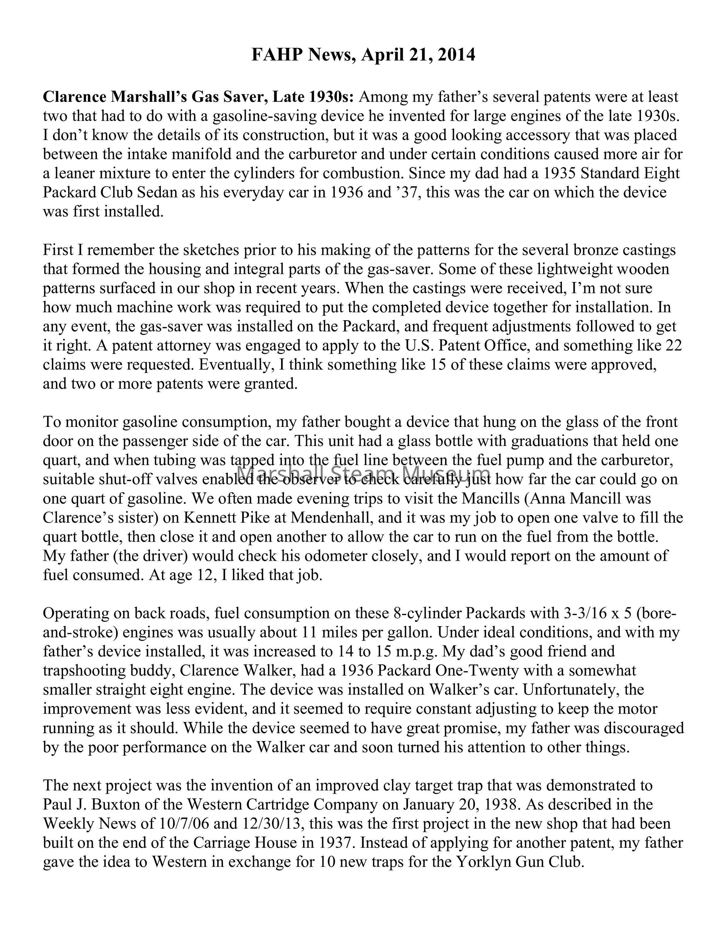 Clarence Marshall’s Gas Saver, Late 1930s: Among my father’s several patents were at least two that had to do with a gasoline-saving device he invented for large engines of the late 1930s. I don’t know the details of its construction, but it was a good looking accessory that was placed between the intake manifold and the carburetor and under certain conditions caused more air for a leaner mixture to enter the cylinders for combustion. Since my dad had a 1935 Standard Eight Packard Club Sedan as his everyday car in 1936 and ’37, this was the car on which the device was first installed.