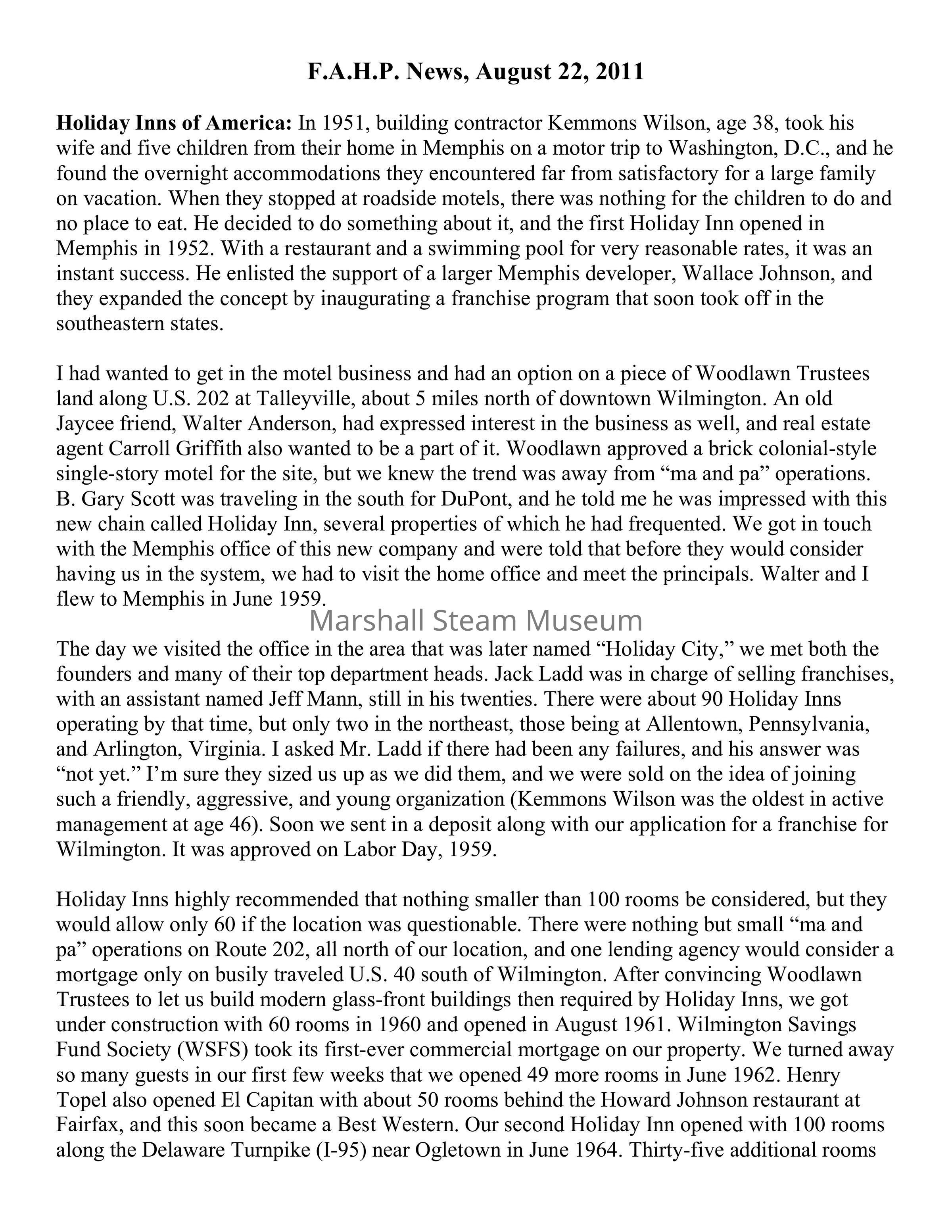 Holiday Inns highly recommended that nothing smaller than 100 rooms be considered, but they would allow only 60 if the location was questionable. There were nothing but small “ma and pa” operations on Route 202, all north of our location, and one lending agency would consider a mortgage only on busily traveled U.S. 40 south of Wilmington. After convincing Woodlawn Trustees to let us build modern glass-front buildings then required by Holiday Inns, we got under construction with 60 rooms in 1960 and opened in August 1961. Wilmington Savings Fund Society (WSFS) took its first-ever commercial mortgage on our property. We turned away so many guests in our first few weeks that we opened 49 more rooms in June 1962. Henry Topel also opened El Capitan with about 50 rooms behind the Howard Johnson restaurant at Fairfax, and this soon became a Best Western. Our second Holiday Inn opened with 100 rooms along the Delaware Turnpike (I-95) near Ogletown in June 1964. Thirty-five additional rooms were added on Route 202 in 1967, and 44 new rooms at Ogletown in 1979. Walter Anderson was the Manager at 202 and General Manager at both Inns. We sold our interest on I-95 in 1983 and on 202 in 1997. In the early years, especially, we had a wonderful working relationship with the home office and won several awards of excellence in the Holiday Inn system. At the high point, about 1980, there were 1,700 Holiday Inns in operation worldwide with about 350,000 rooms. Many modern chains were copied from Kemmons Wilson’s idea.