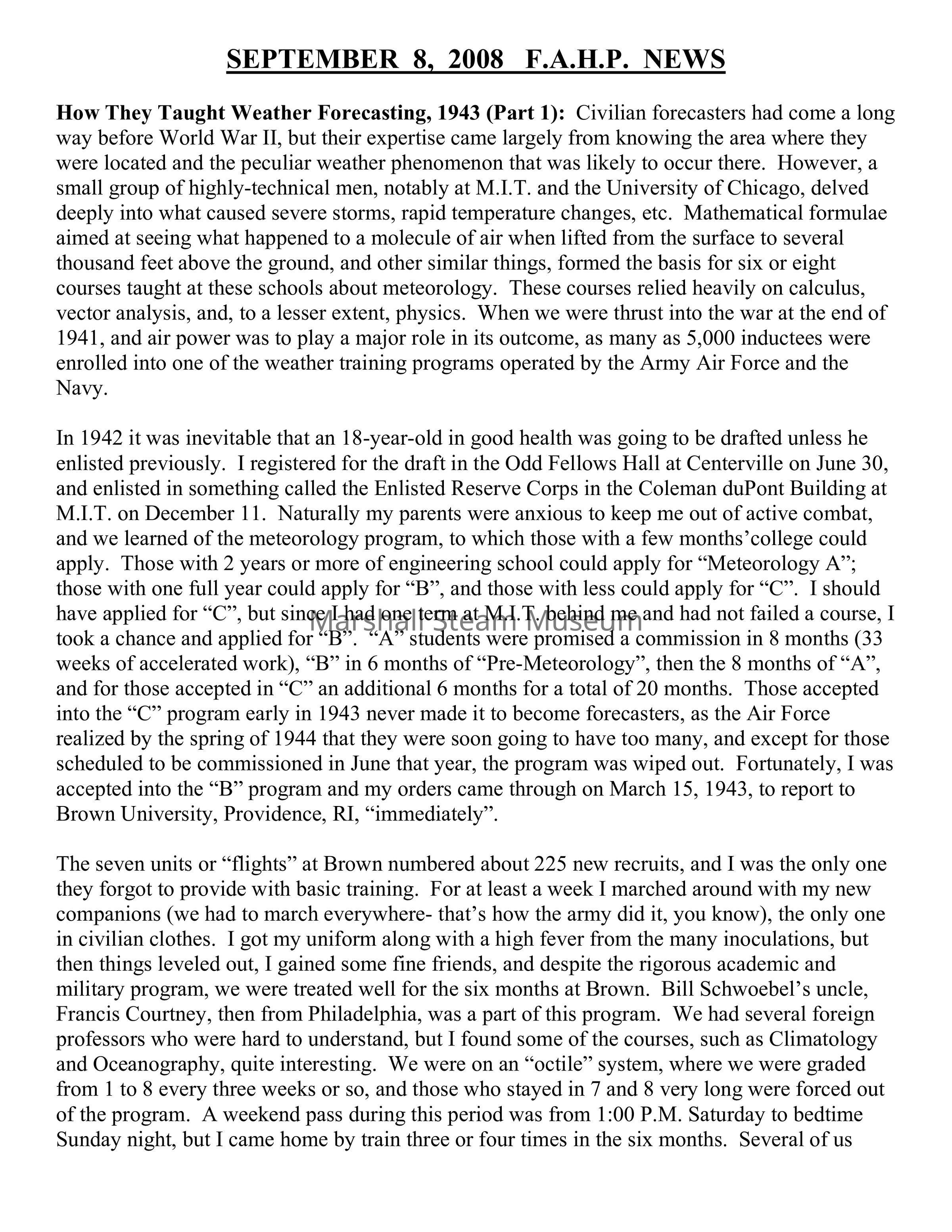 The seven units or “flights” at Brown numbered about 225 new recruits, and I was the only one they forgot to provide with basic training. For at least a week I marched around with my new companions (we had to march everywhere- that’s how the army did it, you know), the only one in civilian clothes. I got my uniform along with a high fever from the many inoculations, but then things leveled out, I gained some fine friends, and despite the rigorous academic and military program, we were treated well for the six months at Brown. Bill Schwoebel’s uncle, Francis Courtney, then from Philadelphia, was a part of this program. We had several foreign professors who were hard to understand, but I found some of the courses, such as Climatology and Oceanography, quite interesting. We were on an “octile” system, where we were graded from 1 to 8 every three weeks or so, and those who stayed in 7 and 8 very long were forced out of the program. A weekend pass during this period was from 1:00 P.M. Saturday to bedtime Sunday night, but I came home by train three or four times in the six months. Several of us went to Boston for a Saturday afternoon and evening on at least two occasions, and I went to a Red Sox game at Fenway Park where Babe Ruth and his wife came in and sat down in the stands to the applause of those in attendance. During our one-week break from classes in late June, we were taken by bus to a Navy Rifle Range at Sachuest Point, RI, where they taught us to shoot a military rifle. I liked that, having been a trapshooter. Except for that trip, every time I left Providence I was on a passenger train, pulled by a steam locomotive- nice! At the end of September, about 150 of us moved on to M.I.T. (and about 15 to Chanute Field, IL) for “Meteorology A”. (The story will be continued in a future “News”).