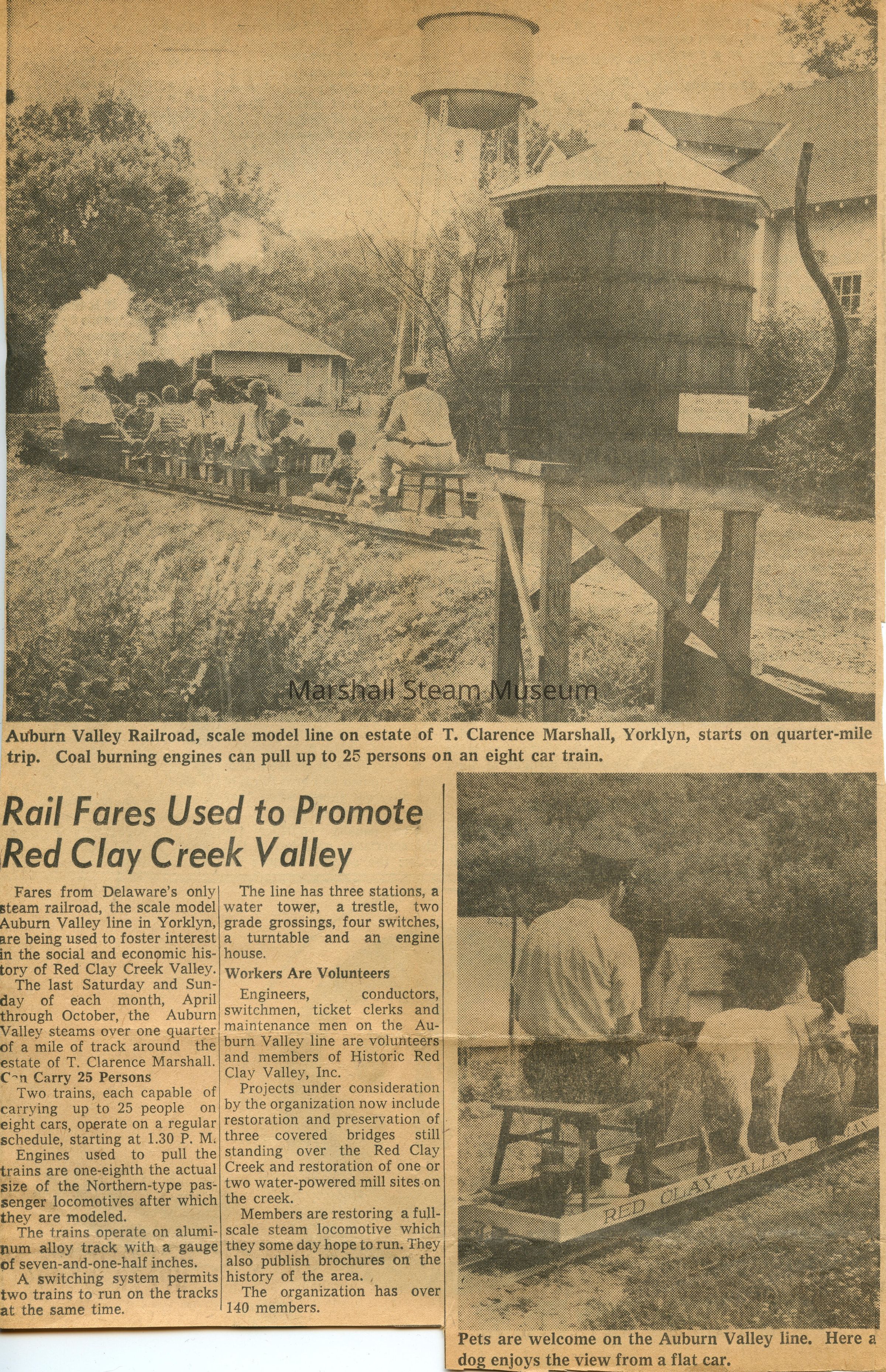 Newspaper clipping describing Delaware's only steam railroad, the scale model Auburn Valley line in Yorklyn, DE. Pictures of two trains carrying children, adults and a dog.