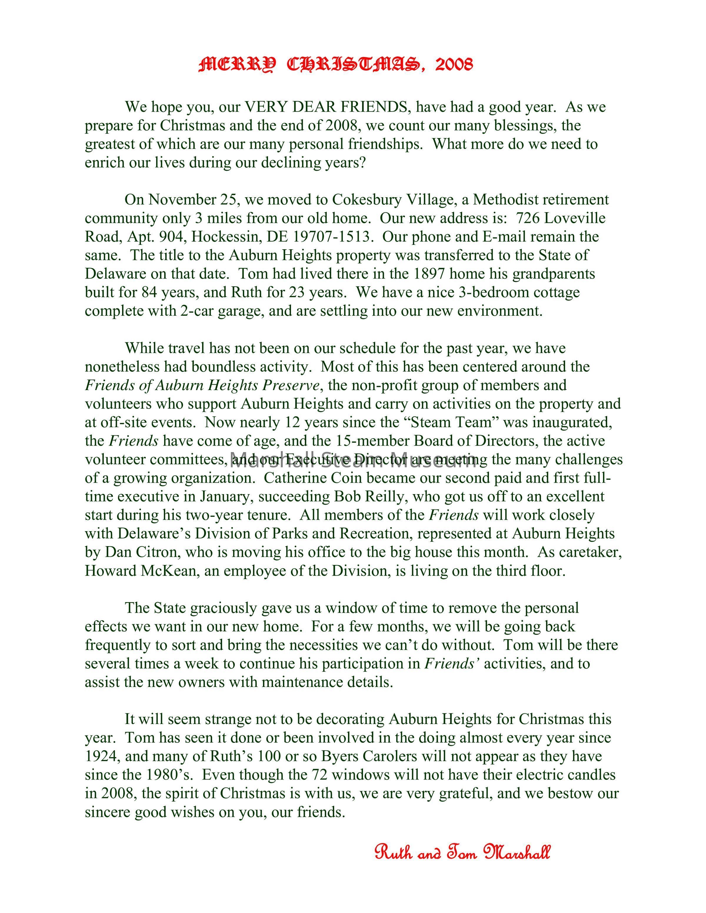 It will seem strange not to be decorating Auburn Heights for Christmas this year. Tom has seen it done or been involved in the doing almost every year since 1924, and many of Ruth’s 100 or so Byers Carolers will not appear as they have since the 1980’s. Even though the 72 windows will not have their electric candles in 2008, the spirit of Christmas is with us, we are very grateful, and we bestow our sincere good wishes on you, our friends.