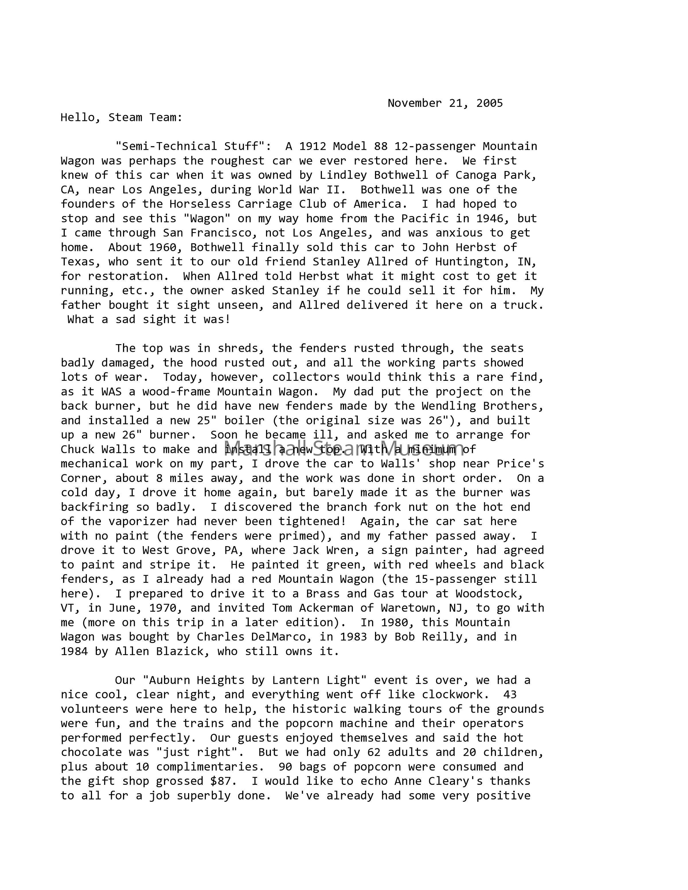"Semi-Technical Stuff": A 1912 Model 88 12-passenger Mountain Wagon was perhaps the roughest car we ever restored here. We first knew of this car when it was owned by Lindley Bothwell of Canoga Park, CA, near Los Angeles, during World War II. Bothwell was one of the founders of the Horseless Carriage Club of America. I had hoped to stop and see this "Wagon" on my way home from the Pacific in 1946, but I came through San Francisco, not Los Angeles, and was anxious to get home. About 1960, Bothwell finally sold this car to John Herbst of Texas, who sent it to our old friend Stanley Allred of Huntington, IN, for restoration. When Allred told Herbst what it might cost to get it running, etc., the owner asked Stanley if he could sell it for him. My father bought it sight unseen, and Allred delivered it here on a truck. What a sad sight it was!