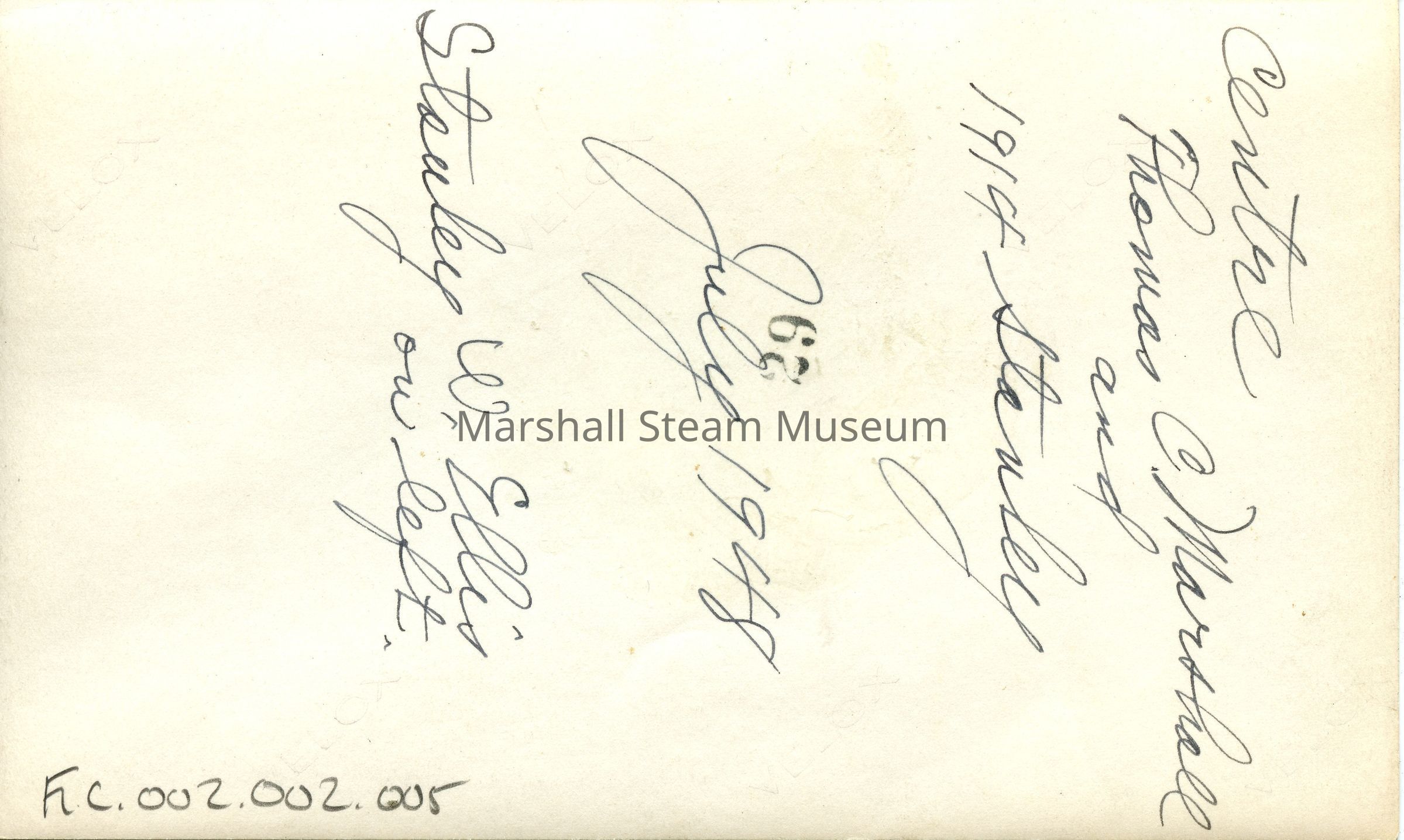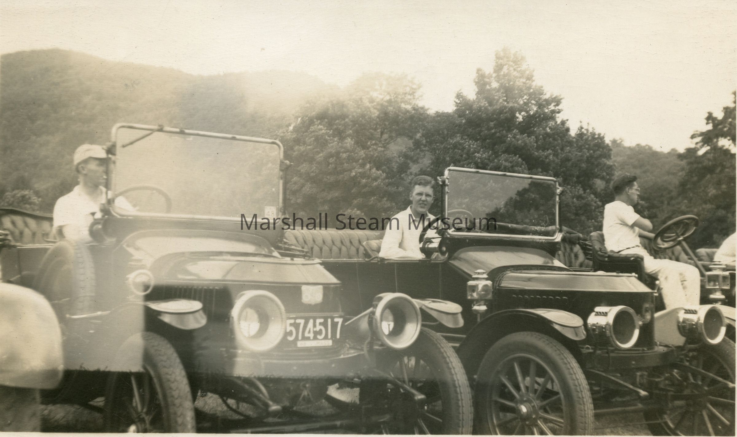 1948 Steam Car Meet - 1914 Stanley Model 607 and Thomas C Marshall, Jr, (center) at Charlemont, MA along with Stanley Ellis in his 1914 Stanley Model 607 (left) and John P Miller in his 1910 White Model OO (right). July 1948Photograph Details