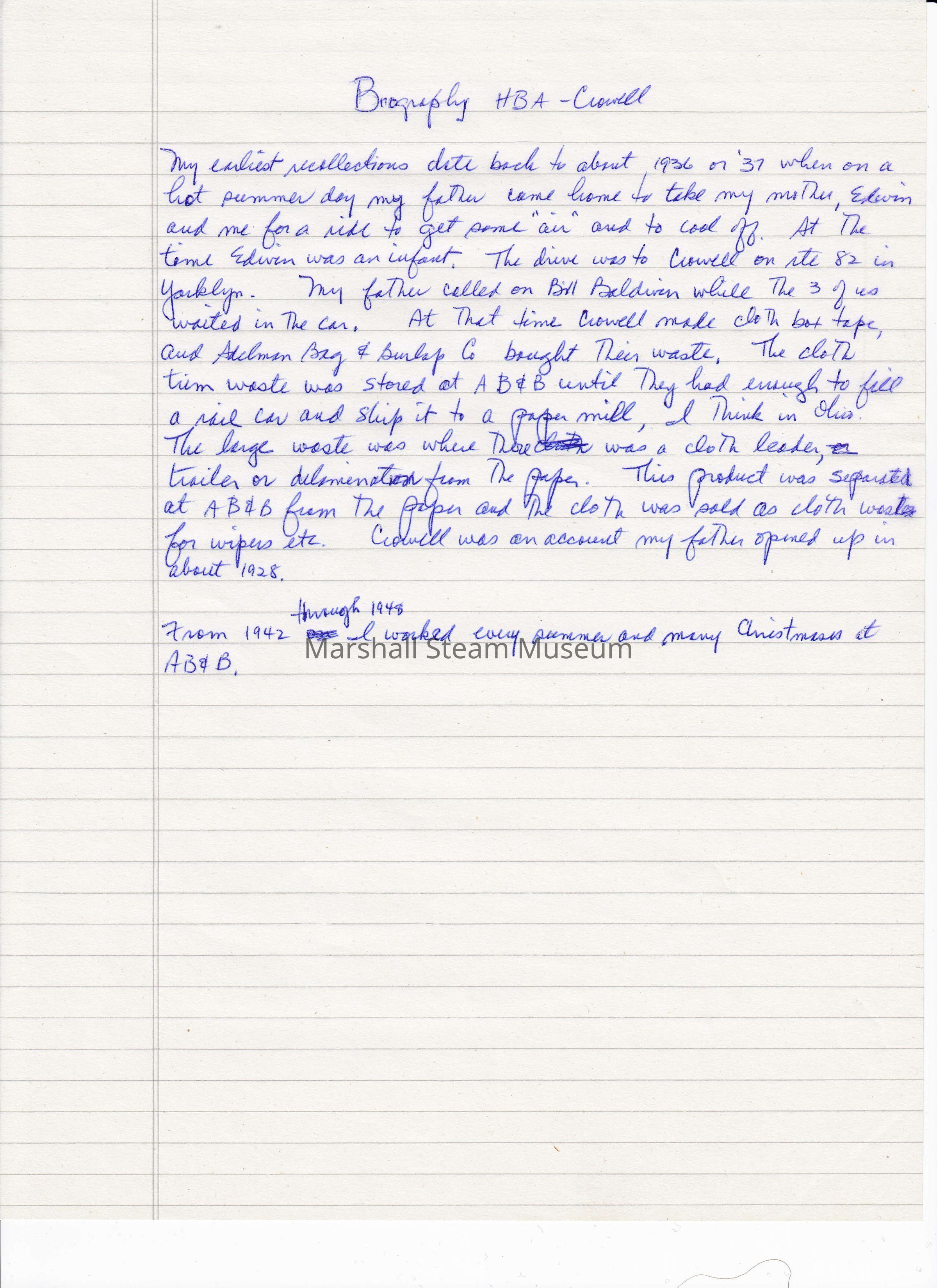 Handwritten note by Herb Adelman regarding his earliest recollections of Crowell Tape and Adelman Bag & Burlap (Herb's father's business)Collection