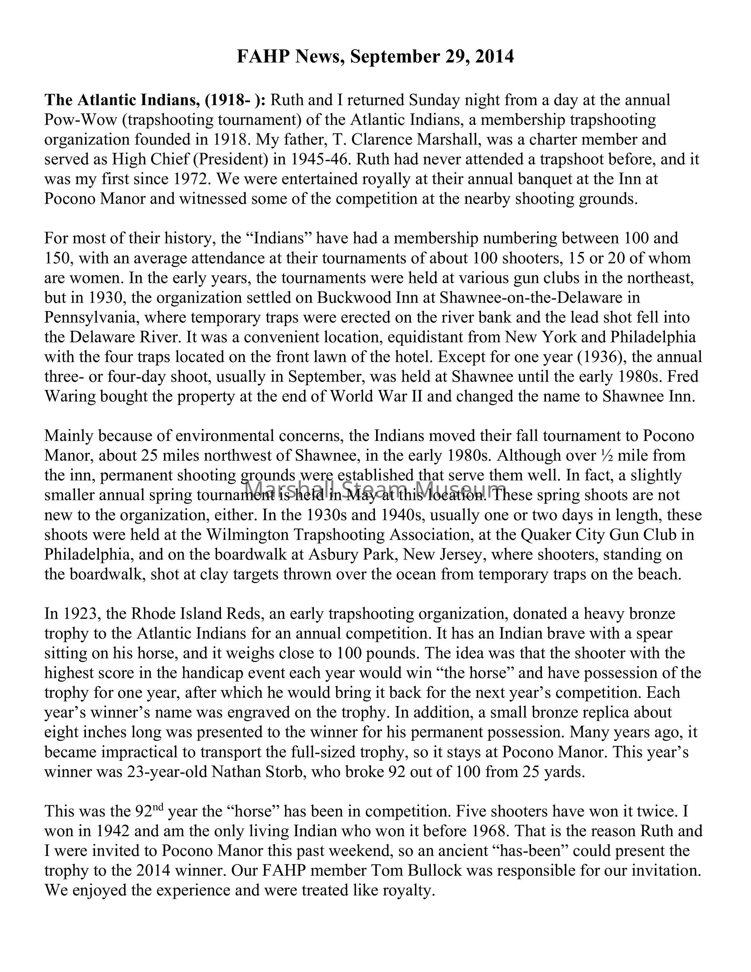 This was the 92nd year the “horse” has been in competition. Five shooters have won it twice. I won in 1942 and am the only living Indian who won it before 1968. That is the reason Ruth and I were invited to Pocono Manor this past weekend, so an ancient “has-been” could present the trophy to the 2014 winner. Our FAHP member Tom Bullock was responsible for our invitation. We enjoyed the experience and were treated like royalty.