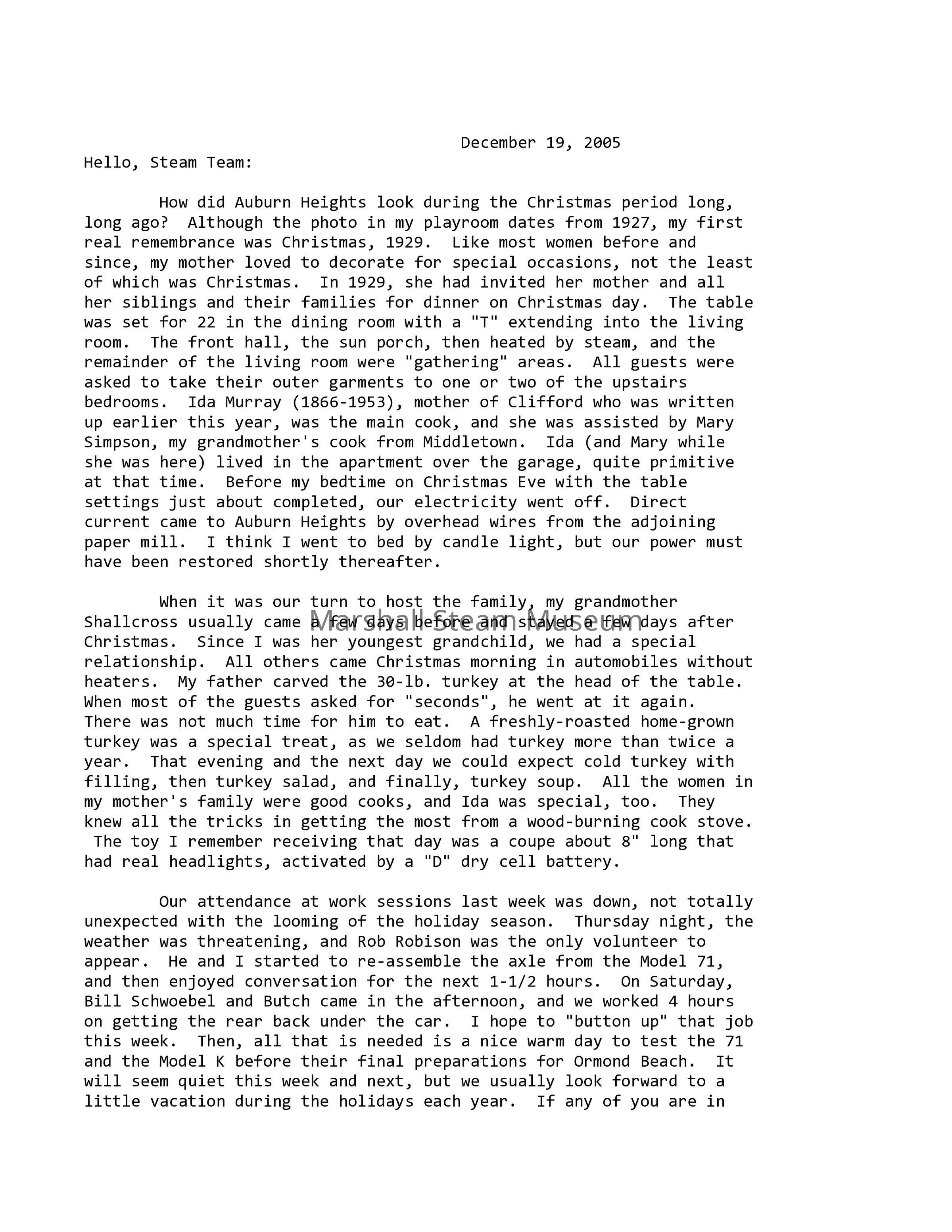Our attendance at work sessions last week was down, not totally unexpected with the looming of the holiday season. Thursday night, the weather was threatening, and Rob Robison was the only volunteer to appear. He and I started to re-assemble the axle from the Model 71, and then enjoyed conversation for the next 1-1/2 hours. On Saturday, Bill Schwoebel and Butch came in the afternoon, and we worked 4 hours on getting the rear back under the car. I hope to "button up" that job this week. Then, all that is needed is a nice warm day to test the 71 and the Model K before their final preparations for Ormond Beach. It will seem quiet this week and next, but we usually look forward to a little vacation during the holidays each year. If any of you are in the middle of a project, however, and want to come on a free day or evening, please feel free to do so. Our Annual Appeal total stands at just over $38,000, with $12,000 to go. We welcome new members Larry Anderson and Brian and Linda Woodcock, and we thank several of you for renewing for 2006 already.
