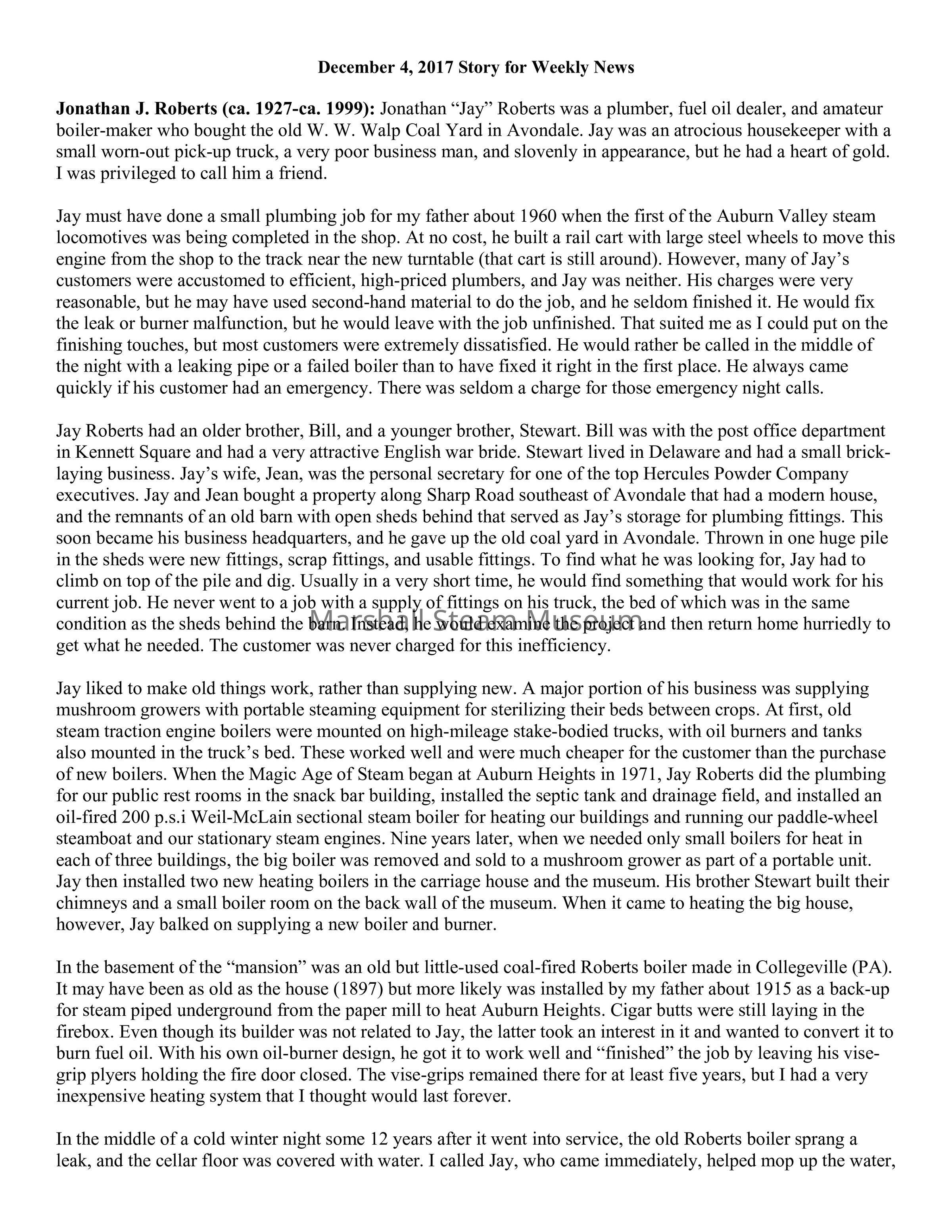 Jonathan J. Roberts (ca. 1927-ca. 1999): Jonathan “Jay” Roberts was a plumber, fuel oil dealer, and amateur boiler-maker who bought the old W. W. Walp Coal Yard in Avondale. Jay was an atrocious housekeeper with a small worn-out pick-up truck, a very poor business man, and slovenly in appearance, but he had a heart of gold. I was privileged to call him a friend.