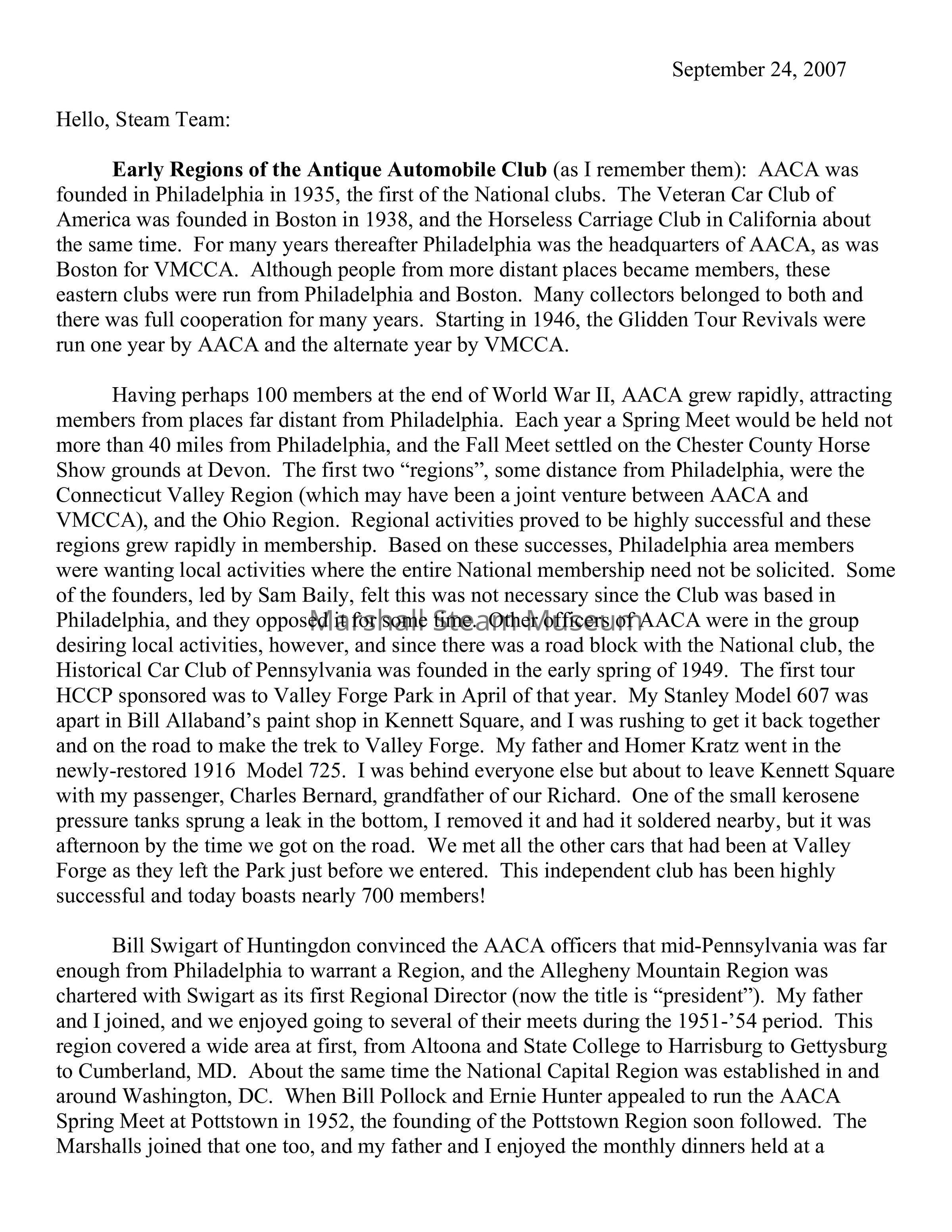 Having perhaps 100 members at the end of World War II, AACA grew rapidly, attracting members from places far distant from Philadelphia. Each year a Spring Meet would be held not more than 40 miles from Philadelphia, and the Fall Meet settled on the Chester County Horse Show grounds at Devon. The first two “regions”, some distance from Philadelphia, were the Connecticut Valley Region (which may have been a joint venture between AACA and VMCCA), and the Ohio Region. Regional activities proved to be highly successful and these regions grew rapidly in membership. Based on these successes, Philadelphia area members were wanting local activities where the entire National membership need not be solicited. Some of the founders, led by Sam Baily, felt this was not necessary since the Club was based in Philadelphia, and they opposed it for some time. Other officers of AACA were in the group desiring local activities, however, and since there was a road block with the National club, the Historical Car Club of Pennsylvania was founded in the early spring of 1949. The first tour HCCP sponsored was to Valley Forge Park in April of that year. My Stanley Model 607 was apart in Bill Allaband’s paint shop in Kennett Square, and I was rushing to get it back together and on the road to make the trek to Valley Forge. My father and Homer Kratz went in the newly-restored 1916 Model 725. I was behind everyone else but about to leave Kennett Square with my passenger, Charles Bernard, grandfather of our Richard. One of the small kerosene pressure tanks sprung a leak in the bottom, I removed it and had it soldered nearby, but it was afternoon by the time we got on the road. We met all the other cars that had been at Valley Forge as they left the Park just before we entered. This independent club has been highly successful and today boasts nearly 700 members!