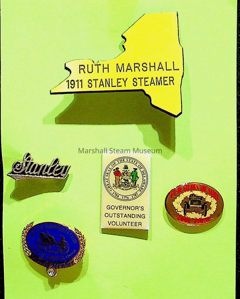 Commemorative lapel pins of Ruth Marshall from various car tours