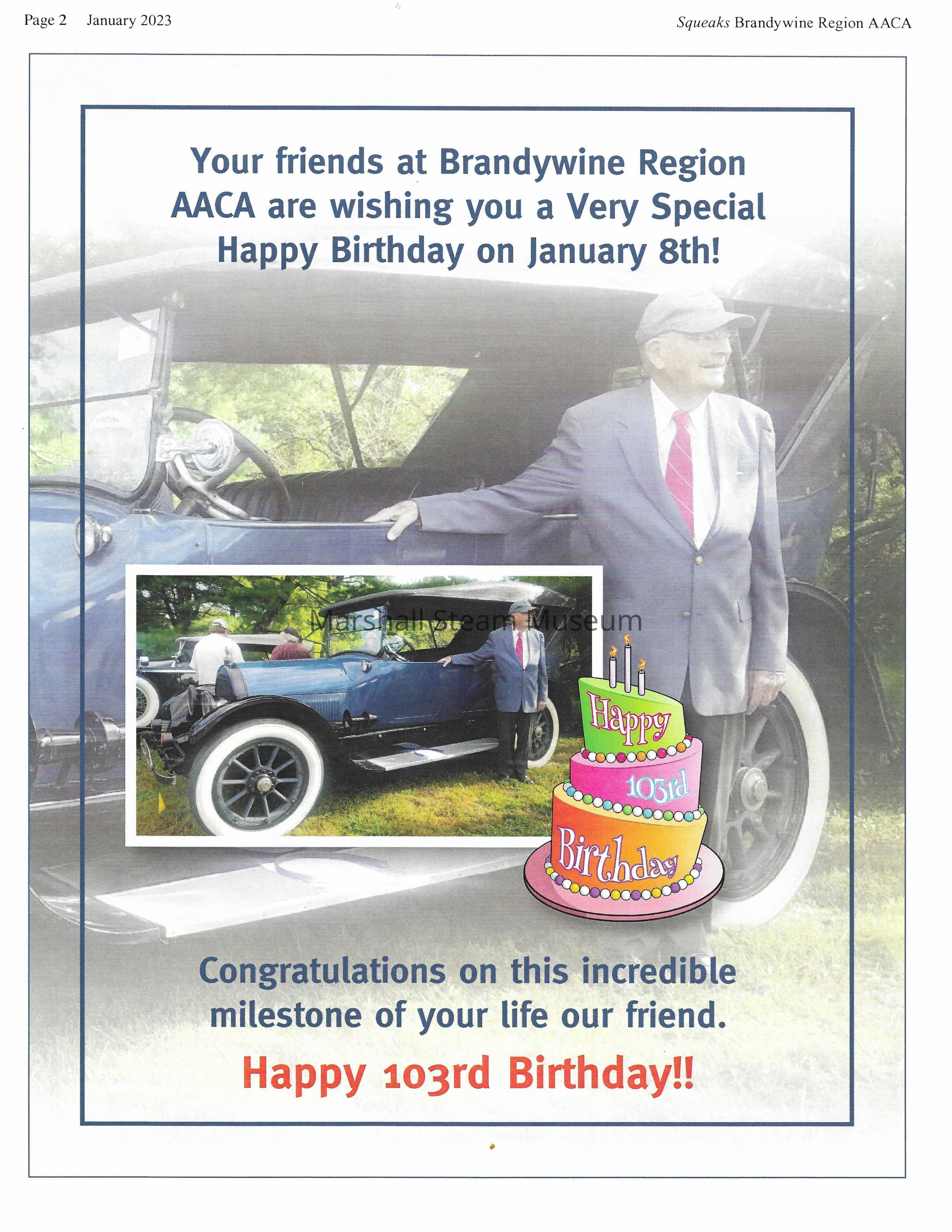 Irenee DuPont birthday wishes in Brandywine Region AACA Squeaks magazine, 2023