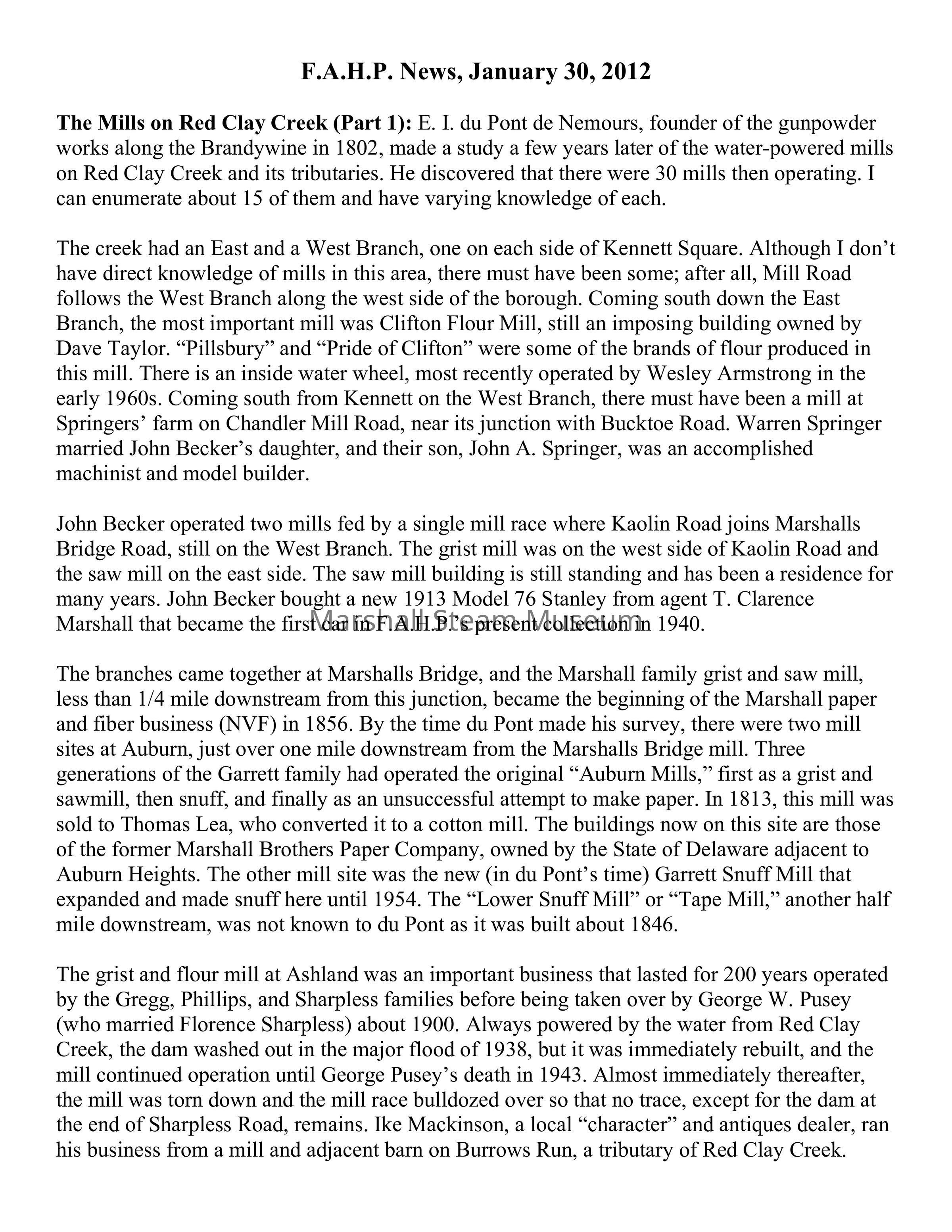 The Mills on Red Clay Creek (Part 1): E. I. du Pont de Nemours, founder of the gunpowder works along the Brandywine in 1802, made a study a few years later of the water-powered mills on Red Clay Creek and its tributaries. He discovered that there were 30 mills then operating. I can enumerate about 15 of them and have varying knowledge of each.
