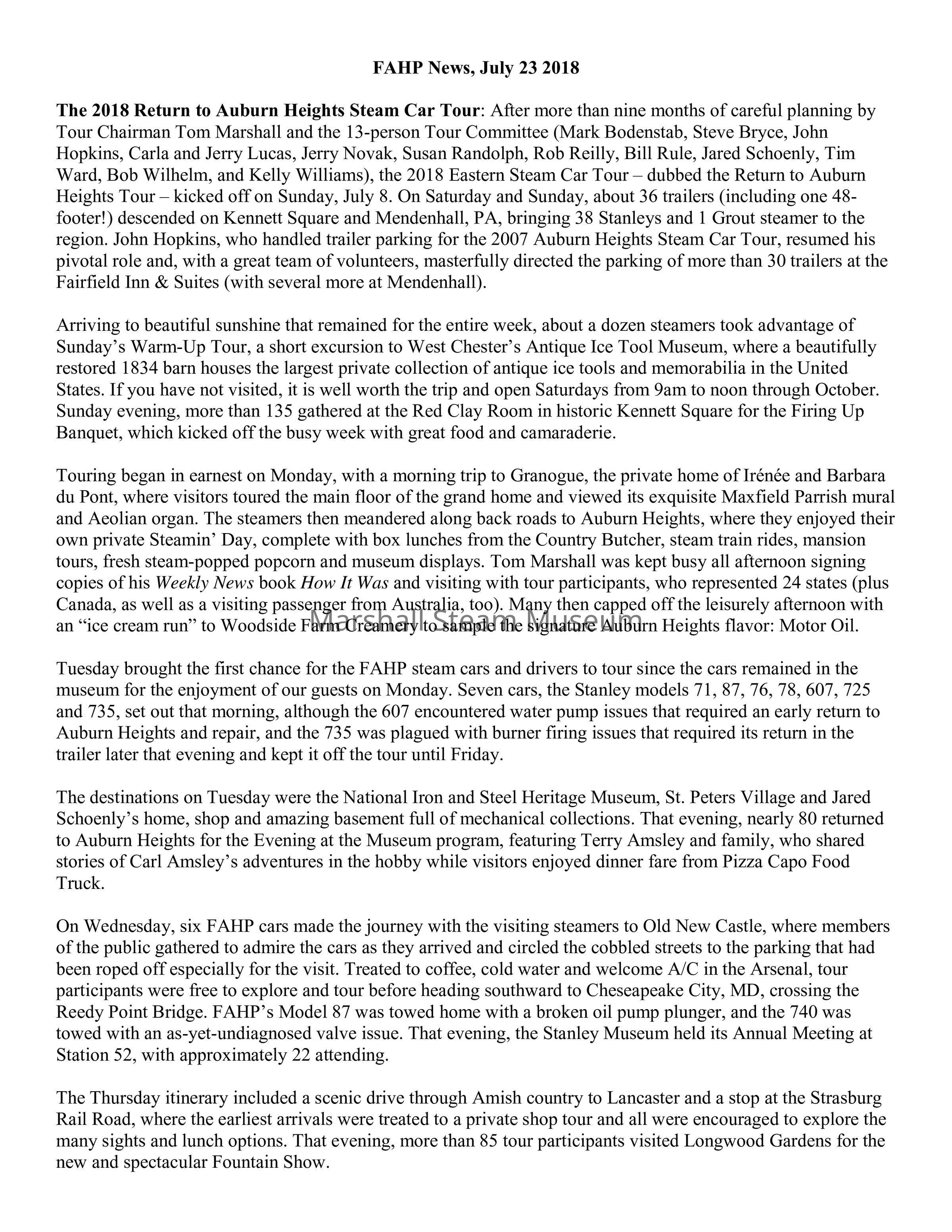 The 2018 Return to Auburn Heights Steam Car Tour: After more than nine months of careful planning by Tour Chairman Tom Marshall and the 13-person Tour Committee (Mark Bodenstab, Steve Bryce, John Hopkins, Carla and Jerry Lucas, Jerry Novak, Susan Randolph, Rob Reilly, Bill Rule, Jared Schoenly, Tim Ward, Bob Wilhelm, and Kelly Williams), the 2018 Eastern Steam Car Tour – dubbed the Return to Auburn Heights Tour – kicked off on Sunday, July 8. On Saturday and Sunday, about 36 trailers (including one 48-footer!) descended on Kennett Square and Mendenhall, PA, bringing 38 Stanleys and 1 Grout steamer to the region. John Hopkins, who handled trailer parking for the 2007 Auburn Heights Steam Car Tour, resumed his pivotal role and, with a great team of volunteers, masterfully directed the parking of more than 30 trailers at the Fairfield Inn & Suites (with several more at Mendenhall).