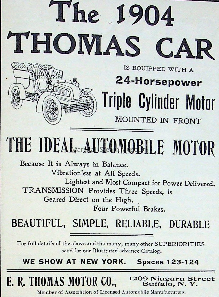 1903 advertisement for Thomas Motor scanned excerpt from December, 1903, issue of "The Automobile" magazine