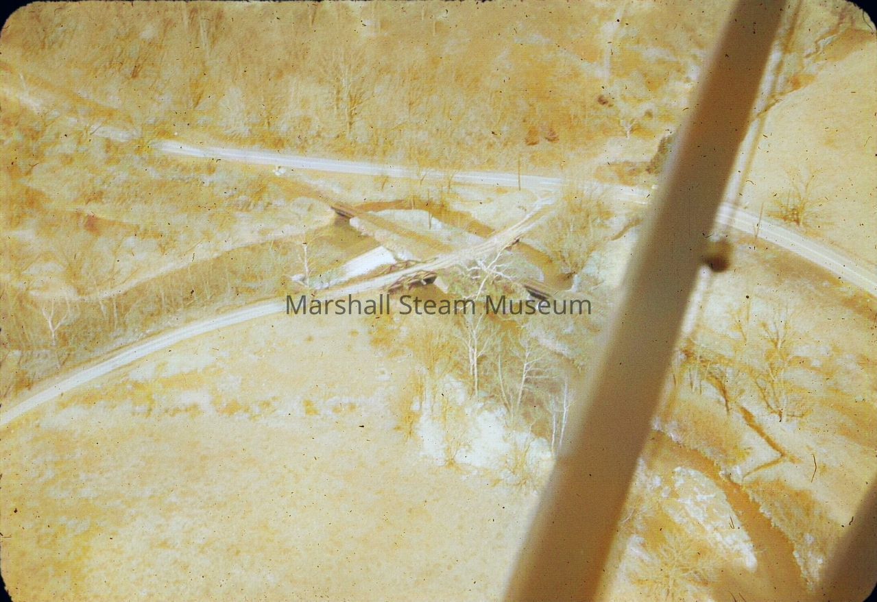 “Pusey’s Dam” was named after the Pusey family who operated the flour mill at Ashland. The dam is located just left of the image center and is much as it remains today. Sharpless Road crossed the Red Clay below the dam and intersects with Creek Road winding upper left to middle right in the slide. Oversee Farm is all the land above Creek Road. The tracks of the Wilmington & Western Railroad cross from upper left to lower right in parallel with Creek Road. This image shows most of the flour mill’s headrace still intact. We see the mill race passing under Sharpless road and the railroad before traveling a short distance and diverted back to Red Clay Creek. The mills were shut down about 10 years prior to when this slide was taken and most of the mill race filled in.Photograph Details