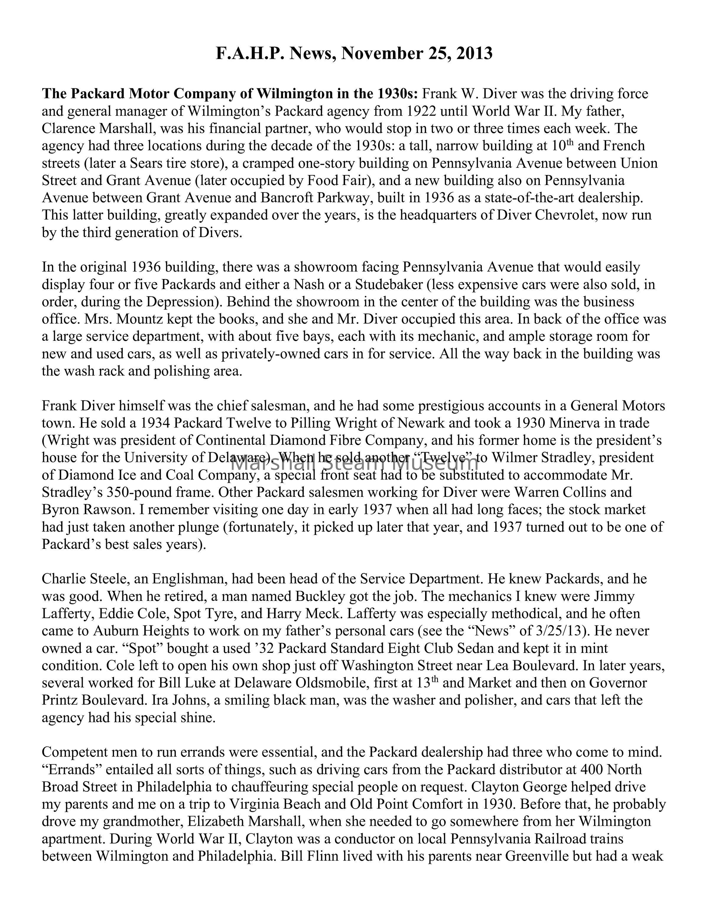 The Packard Motor Company of Wilmington in the 1930s: Frank W. Diver was the driving force and general manager of Wilmington’s Packard agency from 1922 until World War II. My father, Clarence Marshall, was his financial partner, who would stop in two or three times each week. The agency had three locations during the decade of the 1930s: a tall, narrow building at 10th and French streets (later a Sears tire store), a cramped one-story building on Pennsylvania Avenue between Union Street and Grant Avenue (later occupied by Food Fair), and a new building also on Pennsylvania Avenue between Grant Avenue and Bancroft Parkway, built in 1936 as a state-of-the-art dealership. This latter building, greatly expanded over the years, is the headquarters of Diver Chevrolet, now run by the third generation of Divers.