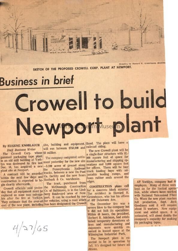 Newspaper clipping of Crowell Tape plans to build new plant, 1965General Notes