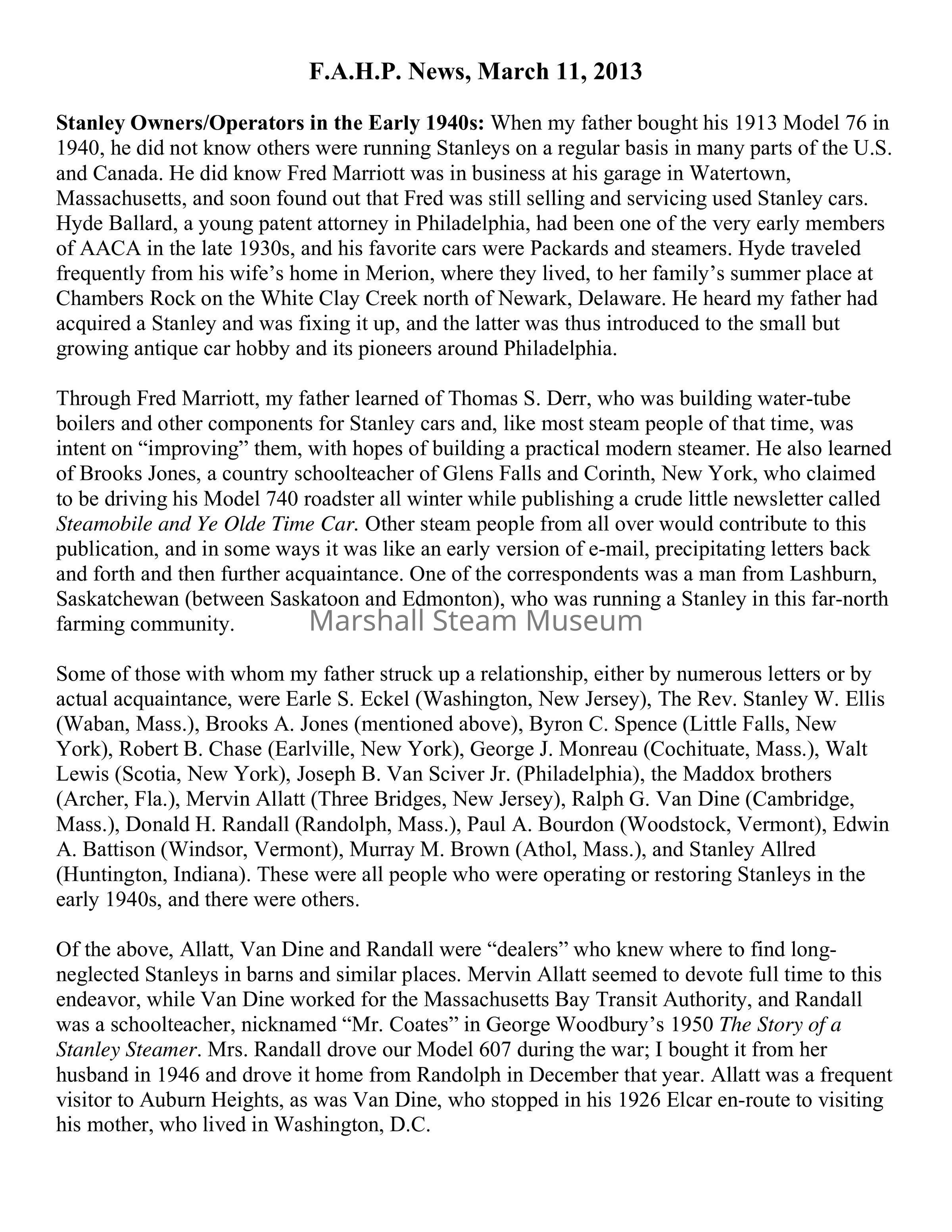 Some of those with whom my father struck up a relationship, either by numerous letters or by actual acquaintance, were Earle S. Eckel (Washington, New Jersey), The Rev. Stanley W. Ellis (Waban, Mass.), Brooks A. Jones (mentioned above), Byron C. Spence (Little Falls, New York), Robert B. Chase (Earlville, New York), George J. Monreau (Cochituate, Mass.), Walt Lewis (Scotia, New York), Joseph B. Van Sciver Jr. (Philadelphia), the Maddox brothers (Archer, Fla.), Mervin Allatt (Three Bridges, New Jersey), Ralph G. Van Dine (Cambridge, Mass.), Donald H. Randall (Randolph, Mass.), Paul A. Bourdon (Woodstock, Vermont), Edwin A. Battison (Windsor, Vermont), Murray M. Brown (Athol, Mass.), and Stanley Allred (Huntington, Indiana). These were all people who were operating or restoring Stanleys in the early 1940s, and there were others.