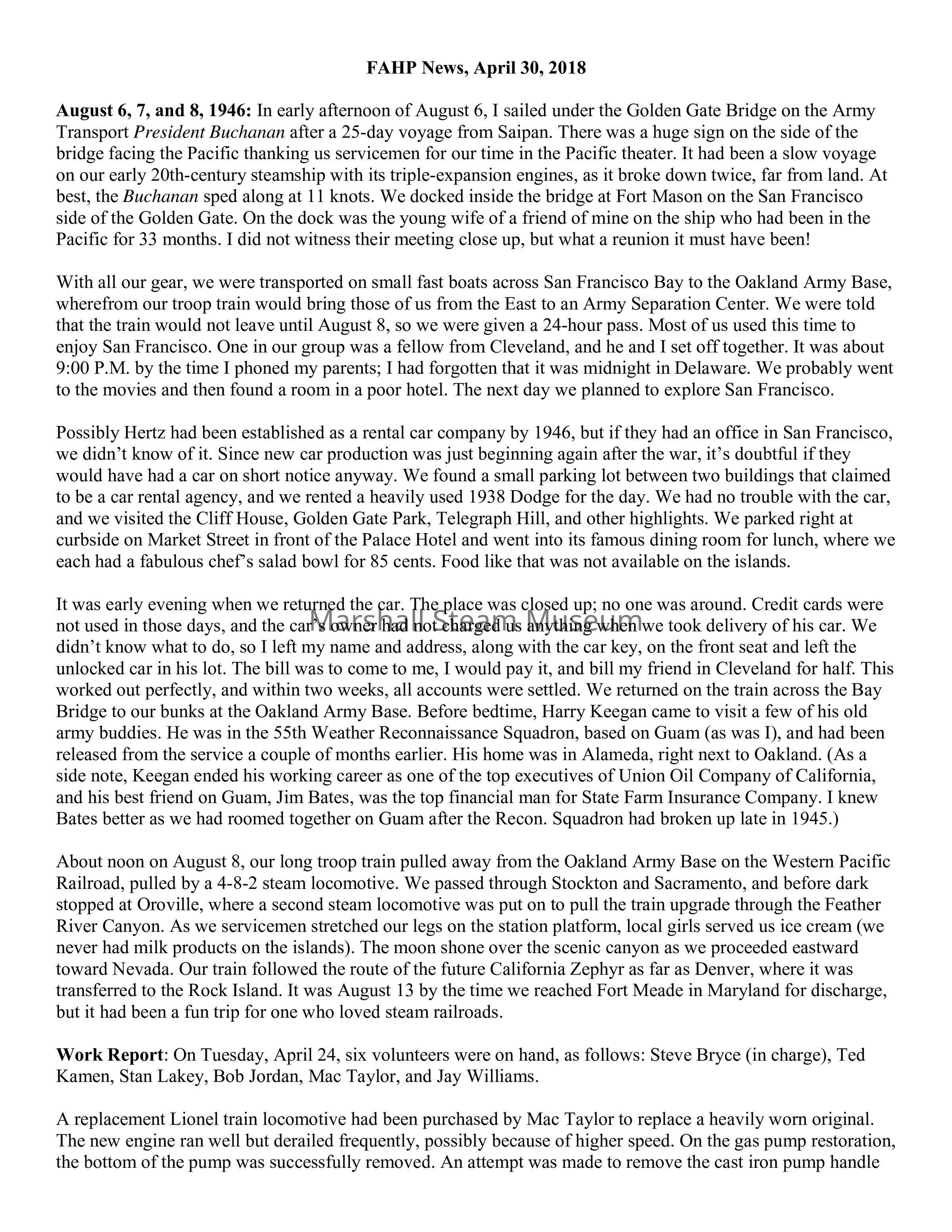 August 6, 7, and 8, 1946: In early afternoon of August 6, I sailed under the Golden Gate Bridge on the Army Transport President Buchanan after a 25-day voyage from Saipan. There was a huge sign on the side of the bridge facing the Pacific thanking us servicemen for our time in the Pacific theater. It had been a slow voyage on our early 20th-century steamship with its triple-expansion engines, as it broke down twice, far from land. At best, the Buchanan sped along at 11 knots. We docked inside the bridge at Fort Mason on the San Francisco side of the Golden Gate. On the dock was the young wife of a friend of mine on the ship who had been in the Pacific for 33 months. I did not witness their meeting close up, but what a reunion it must have been!