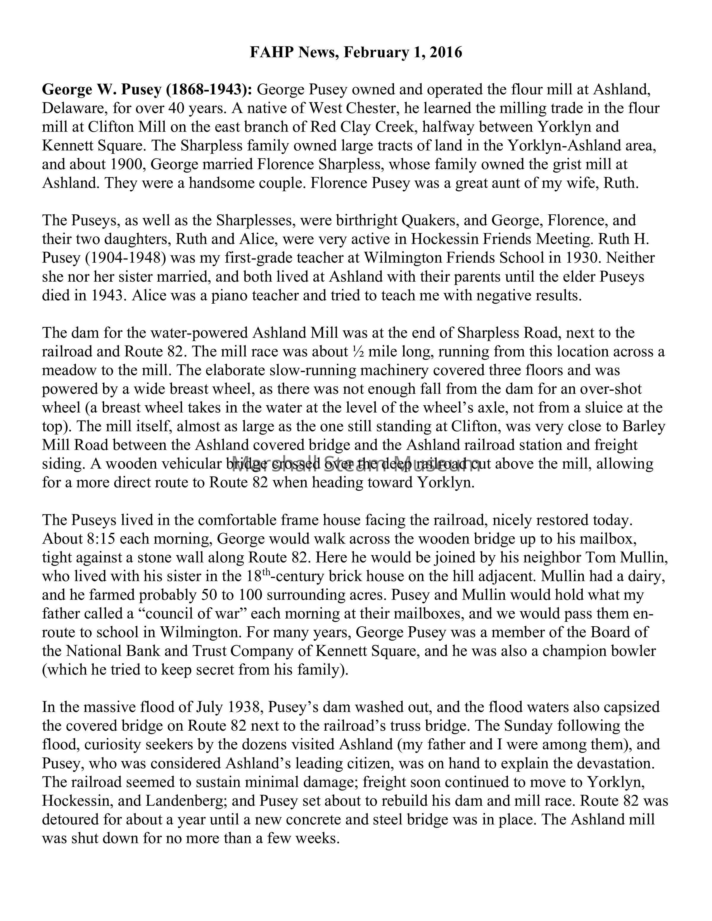 George W. Pusey (1868-1943): George Pusey owned and operated the flour mill at Ashland, Delaware, for over 40 years. A native of West Chester, he learned the milling trade in the flour mill at Clifton Mill on the east branch of Red Clay Creek, halfway between Yorklyn and Kennett Square. The Sharpless family owned large tracts of land in the Yorklyn-Ashland area, and about 1900, George married Florence Sharpless, whose family owned the grist mill at Ashland. They were a handsome couple. Florence Pusey was a great aunt of my wife, Ruth.