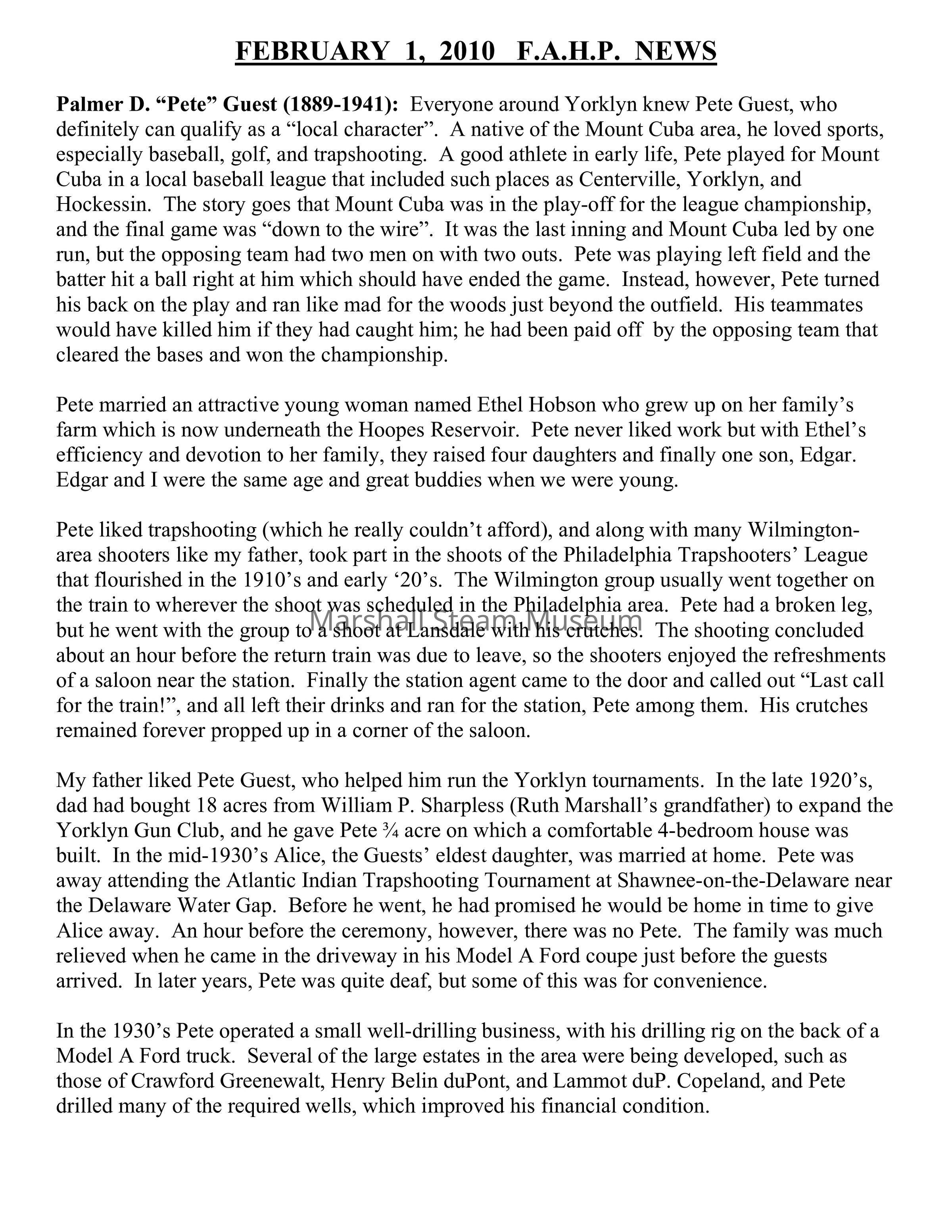 Palmer D. “Pete” Guest (1889-1941): Everyone around Yorklyn knew Pete Guest, who definitely can qualify as a “local character”. A native of the Mount Cuba area, he loved sports, especially baseball, golf, and trapshooting. A good athlete in early life, Pete played for Mount Cuba in a local baseball league that included such places as Centerville, Yorklyn, and Hockessin. The story goes that Mount Cuba was in the play-off for the league championship, and the final game was “down to the wire”. It was the last inning and Mount Cuba led by one run, but the opposing team had two men on with two outs. Pete was playing left field and the batter hit a ball right at him which should have ended the game. Instead, however, Pete turned his back on the play and ran like mad for the woods just beyond the outfield. His teammates would have killed him if they had caught him; he had been paid off by the opposing team that cleared the bases and won the championship.