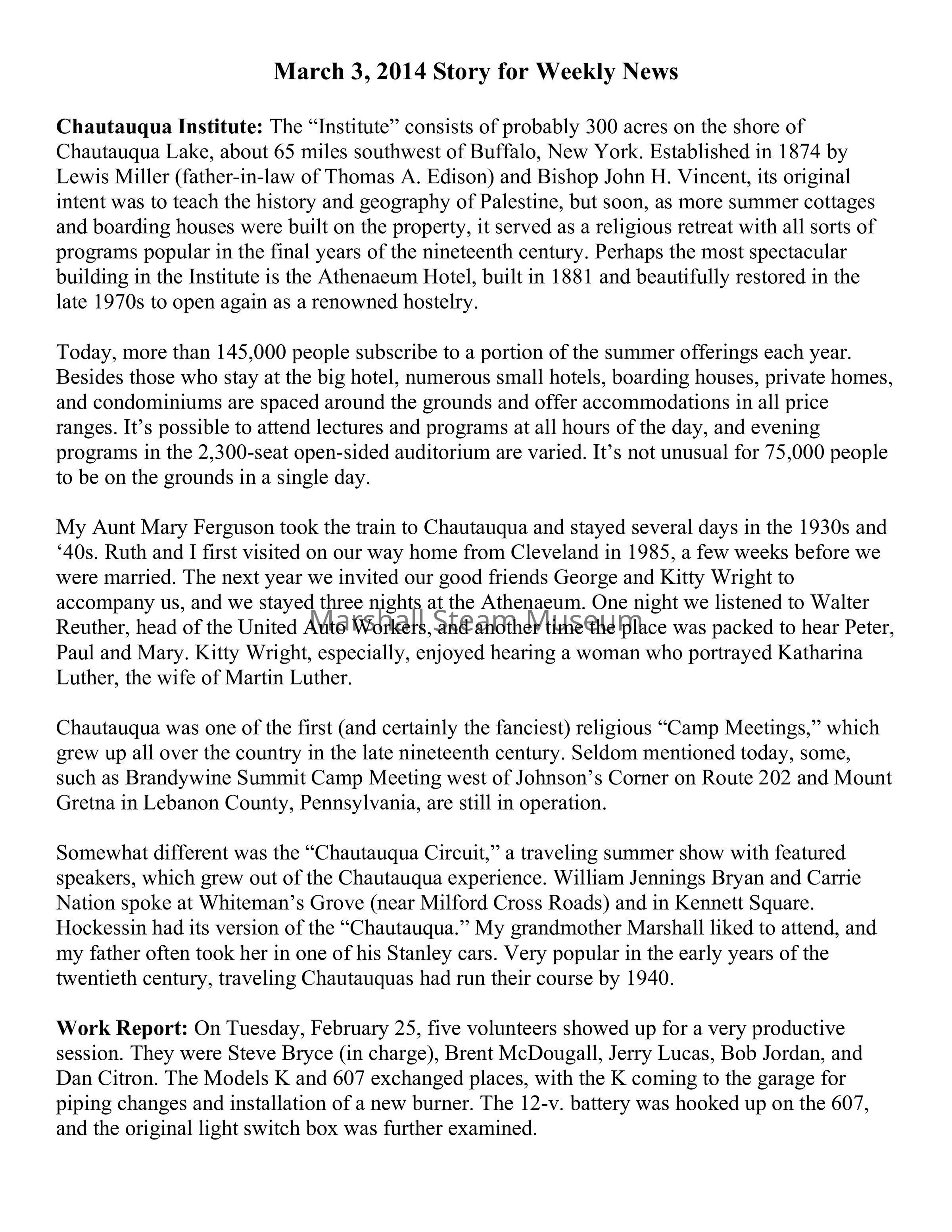 My Aunt Mary Ferguson took the train to Chautauqua and stayed several days in the 1930s and ‘40s. Ruth and I first visited on our way home from Cleveland in 1985, a few weeks before we were married. The next year we invited our good friends George and Kitty Wright to accompany us, and we stayed three nights at the Athenaeum. One night we listened to Walter Reuther, head of the United Auto Workers, and another time the place was packed to hear Peter, Paul and Mary. Kitty Wright, especially, enjoyed hearing a woman who portrayed Katharina Luther, the wife of Martin Luther.