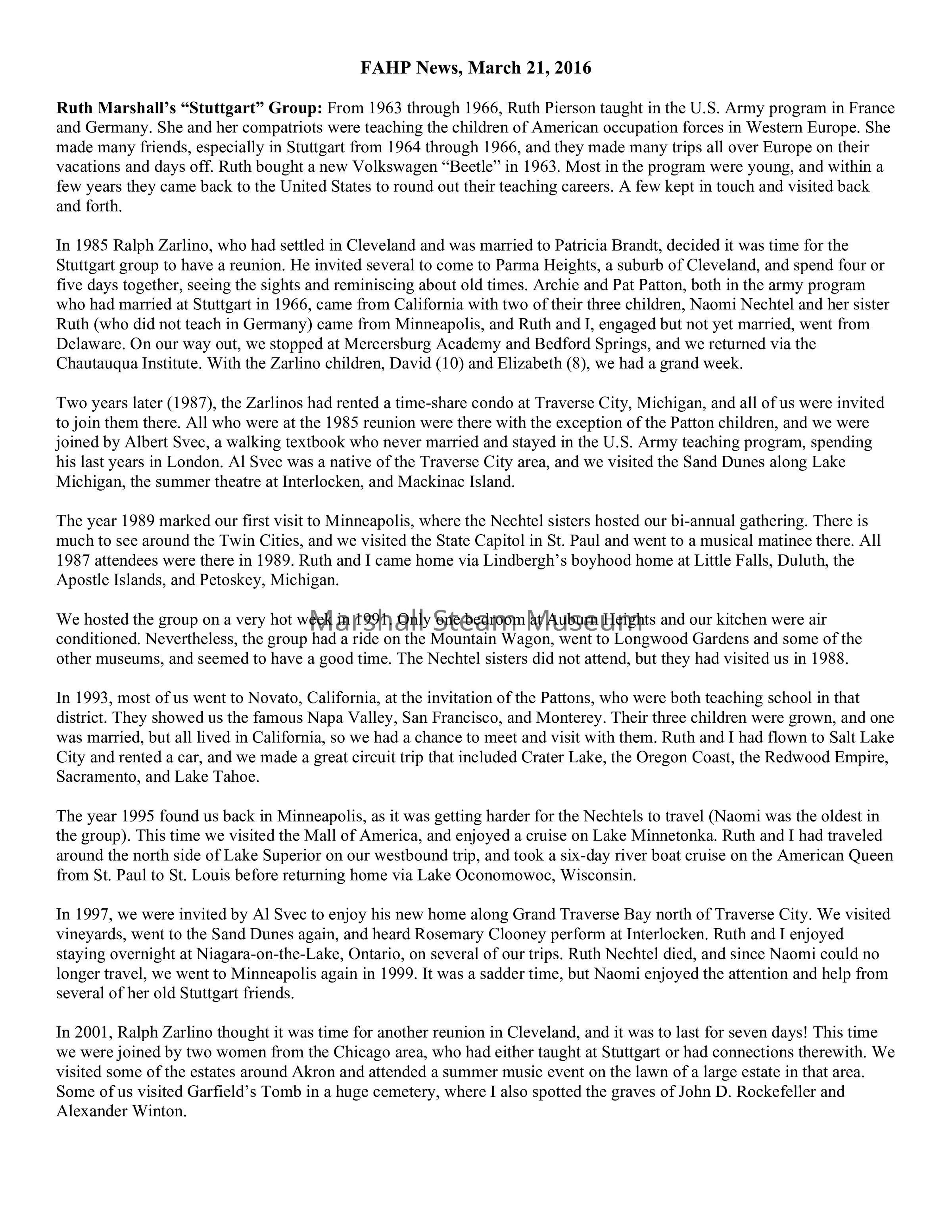 Ruth Marshall’s “Stuttgart” Group: From 1963 through 1966, Ruth Pierson taught in the U.S. Army program in France and Germany. She and her compatriots were teaching the children of American occupation forces in Western Europe. She made many friends, especially in Stuttgart from 1964 through 1966, and they made many trips all over Europe on their vacations and days off. Ruth bought a new Volkswagen “Beetle” in 1963. Most in the program were young, and within a few years they came back to the United States to round out their teaching careers. A few kept in touch and visited back and forth.