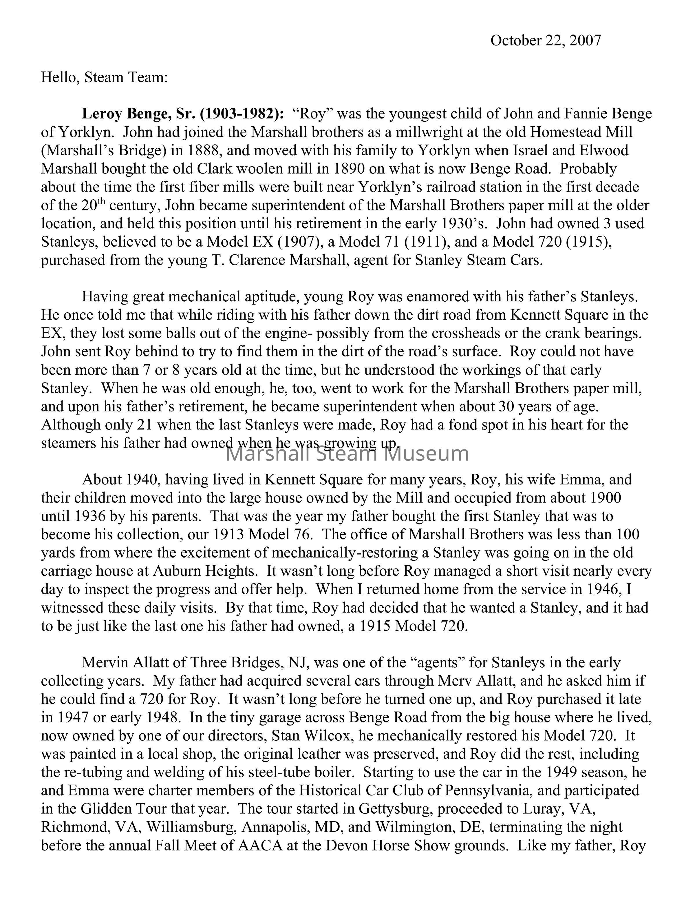 Leroy Benge, Sr. (1903-1982): “Roy” was the youngest child of John and Fannie Benge of Yorklyn. John had joined the Marshall brothers as a millwright at the old Homestead Mill (Marshall’s Bridge) in 1888, and moved with his family to Yorklyn when Israel and Elwood Marshall bought the old Clark woolen mill in 1890 on what is now Benge Road. Probably about the time the first fiber mills were built near Yorklyn’s railroad station in the first decade of the 20th century, John became superintendent of the Marshall Brothers paper mill at the older location, and held this position until his retirement in the early 1930’s. John had owned 3 used Stanleys, believed to be a Model EX (1907), a Model 71 (1911), and a Model 720 (1915), purchased from the young T. Clarence Marshall, agent for Stanley Steam Cars.
