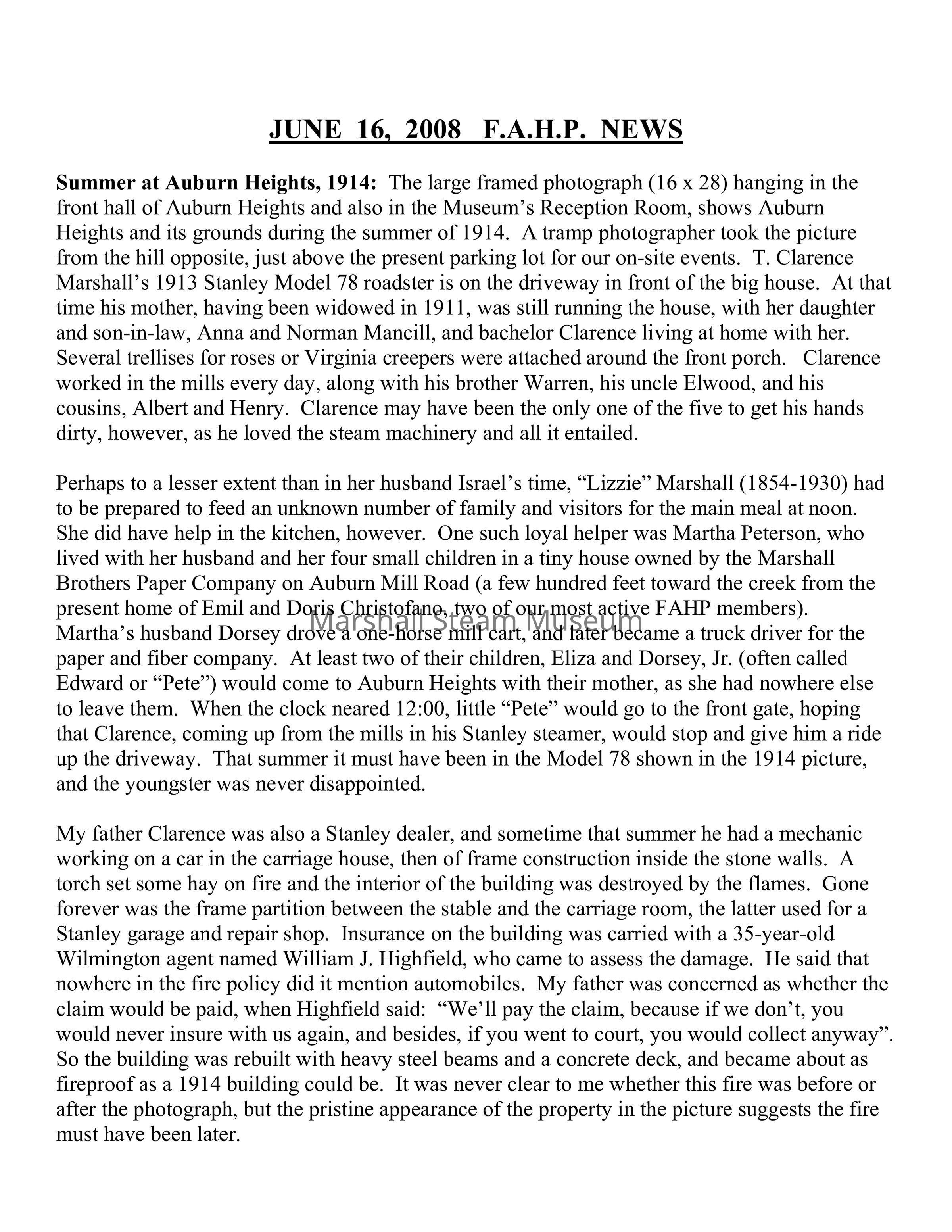 Summer at Auburn Heights, 1914: The large framed photograph (16 x 28) hanging in the front hall of Auburn Heights and also in the Museum’s Reception Room, shows Auburn Heights and its grounds during the summer of 1914. A tramp photographer took the picture from the hill opposite, just above the present parking lot for our on-site events. T. Clarence Marshall’s 1913 Stanley Model 78 roadster is on the driveway in front of the big house. At that time his mother, having been widowed in 1911, was still running the house, with her daughter and son-in-law, Anna and Norman Mancill, and bachelor Clarence living at home with her. Several trellises for roses or Virginia creepers were attached around the front porch. Clarence worked in the mills every day, along with his brother Warren, his uncle Elwood, and his cousins, Albert and Henry. Clarence may have been the only one of the five to get his hands dirty, however, as he loved the steam machinery and all it entailed.
