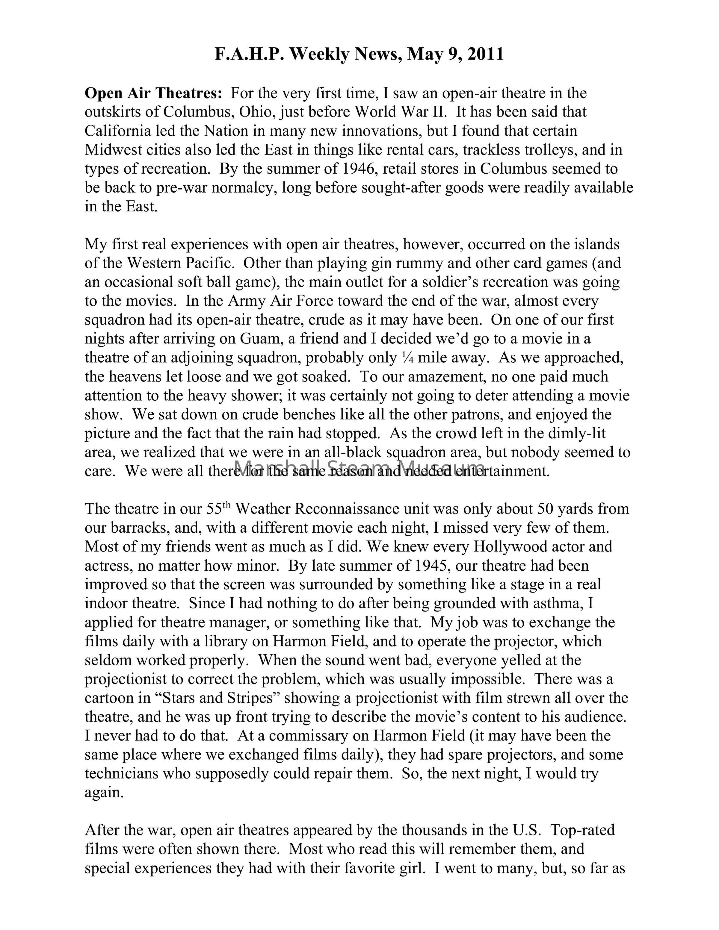 My first real experiences with open air theatres, however, occurred on the islands of the Western Pacific. Other than playing gin rummy and other card games (and an occasional soft ball game), the main outlet for a soldier’s recreation was going to the movies. In the Army Air Force toward the end of the war, almost every squadron had its open-air theatre, crude as it may have been. On one of our first nights after arriving on Guam, a friend and I decided we’d go to a movie in a theatre of an adjoining squadron, probably only ¼ mile away. As we approached, the heavens let loose and we got soaked. To our amazement, no one paid much attention to the heavy shower; it was certainly not going to deter attending a movie show. We sat down on crude benches like all the other patrons, and enjoyed the picture and the fact that the rain had stopped. As the crowd left in the dimly-lit area, we realized that we were in an all-black squadron area, but nobody seemed to care. We were all there for the same reason and needed entertainment.
