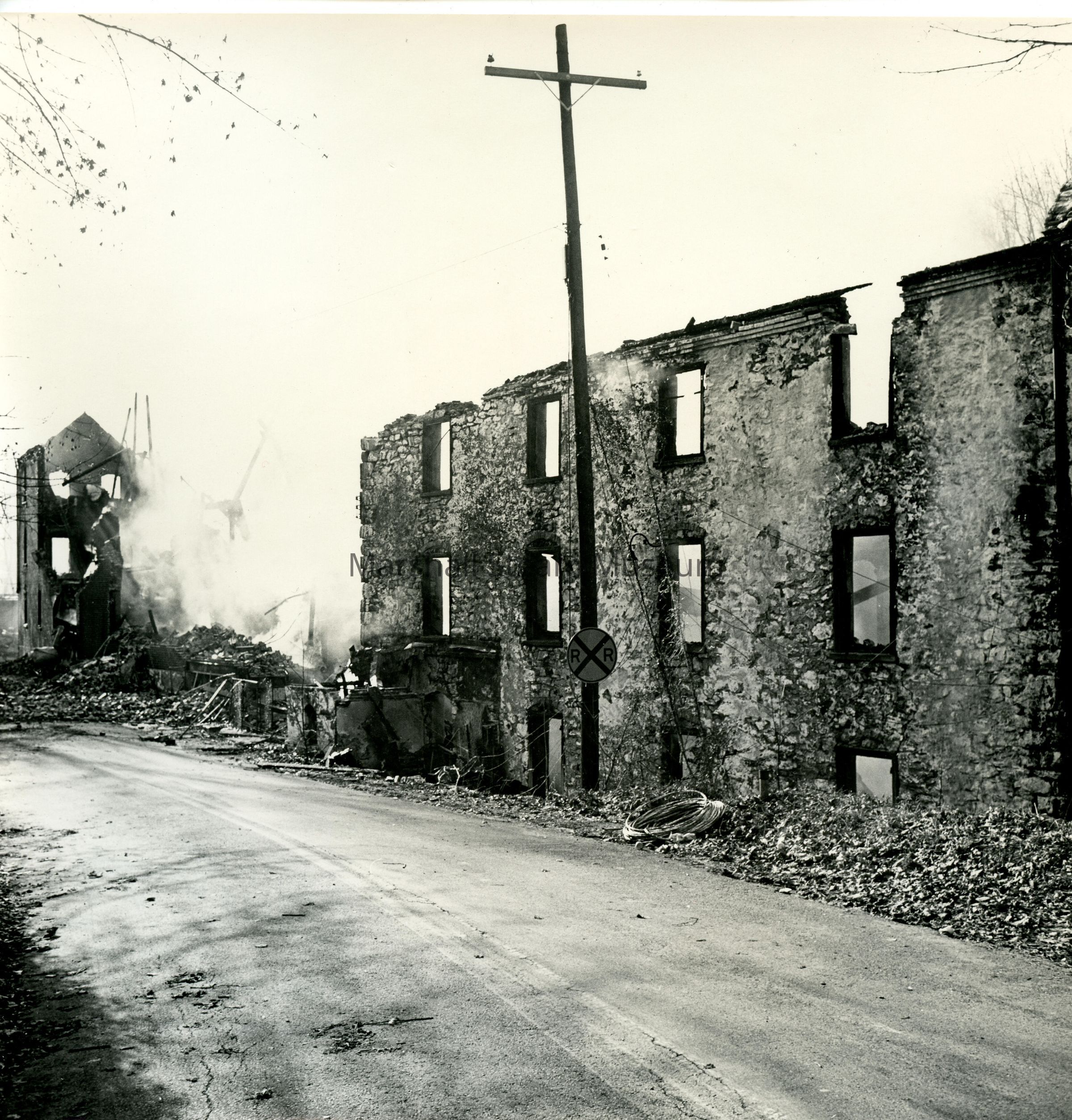 Brick shell of building after fire with clean-up in progress viewed from Route 82, December 1964Photograph Details