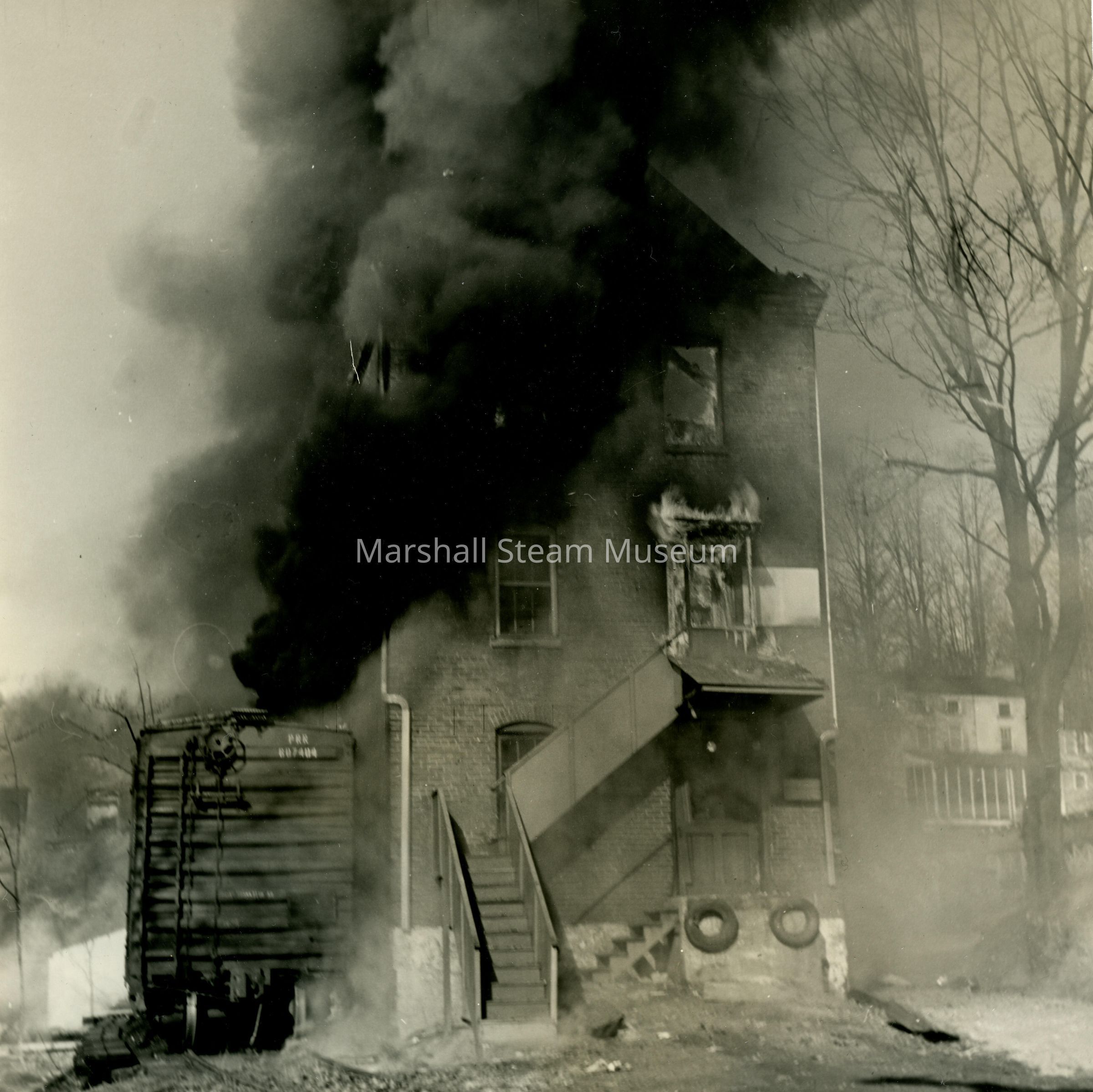 Building on fire with heavy smoke and fire from second story door, December 1964Photograph Details
