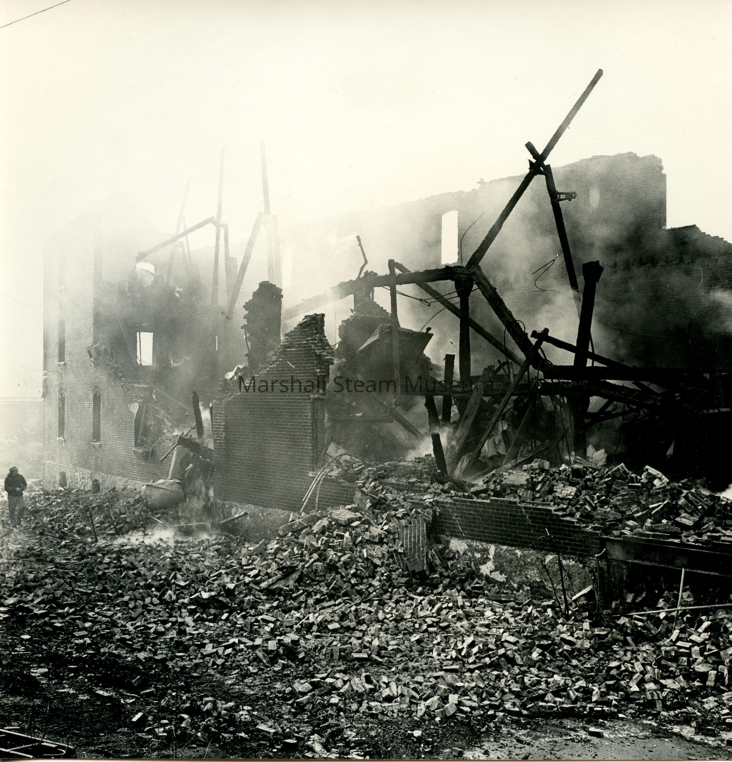 Brick wall collapse onto Route 82 with smoke still emanating, December 1964Photograph Details