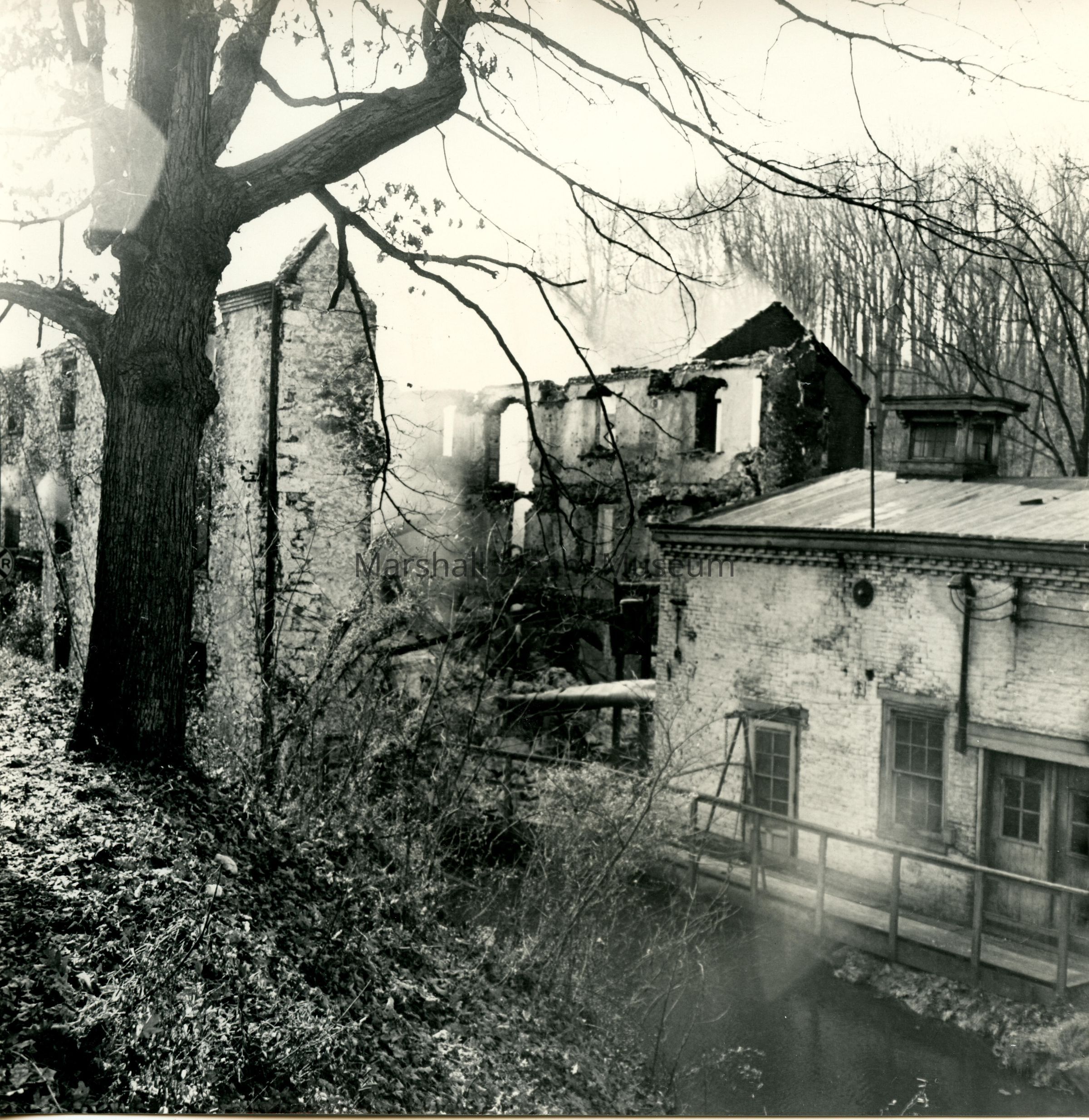 Crowell Tape Mill main building after fire and partially burned building viewed from across Red Clay Creek, December 1964Photograph Details