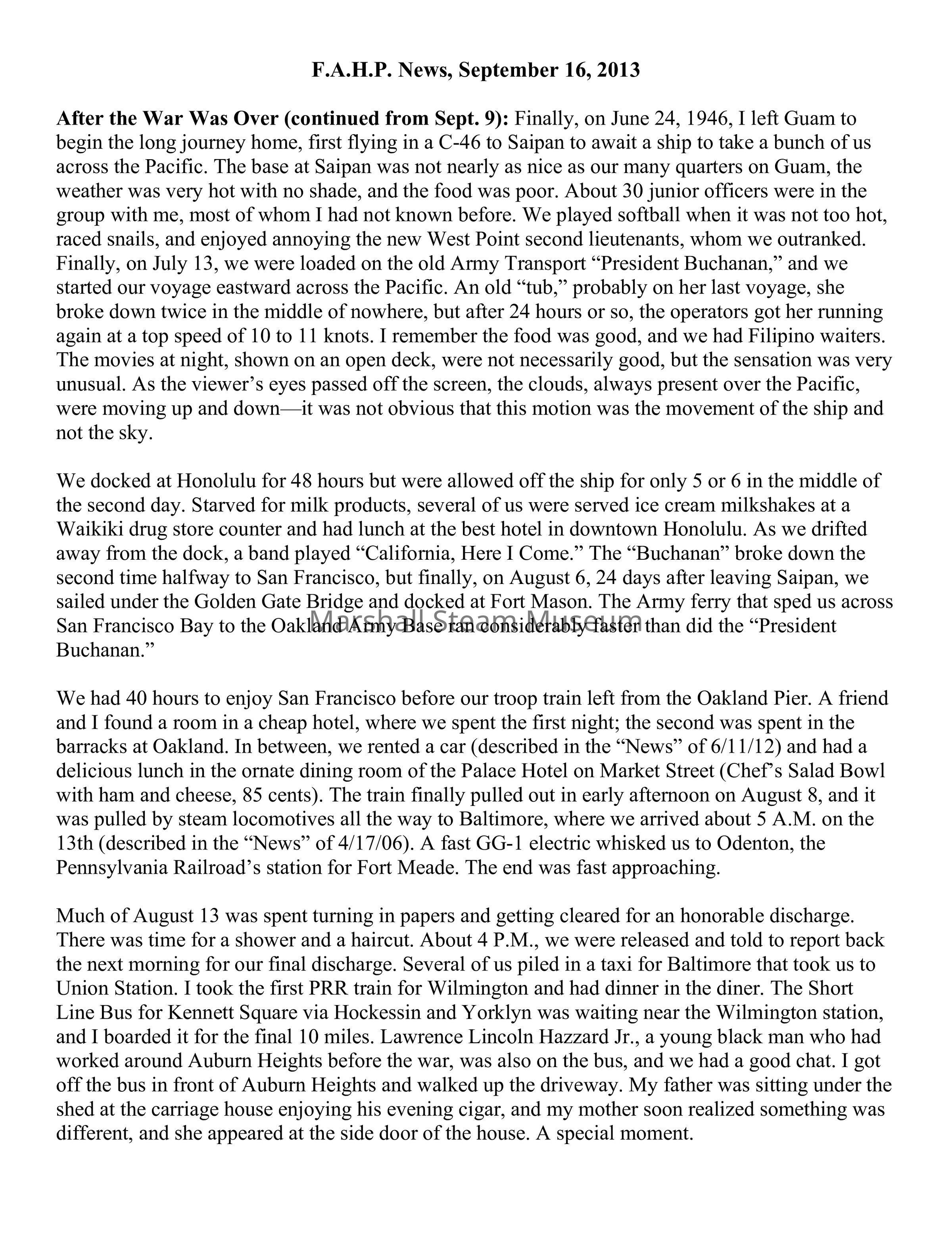 We docked at Honolulu for 48 hours but were allowed off the ship for only 5 or 6 in the middle of the second day. Starved for milk products, several of us were served ice cream milkshakes at a Waikiki drug store counter and had lunch at the best hotel in downtown Honolulu. As we drifted away from the dock, a band played “California, Here I Come.” The “Buchanan” broke down the second time halfway to San Francisco, but finally, on August 6, 24 days after leaving Saipan, we sailed under the Golden Gate Bridge and docked at Fort Mason. The Army ferry that sped us across San Francisco Bay to the Oakland Army Base ran considerably faster than did the “President Buchanan.”