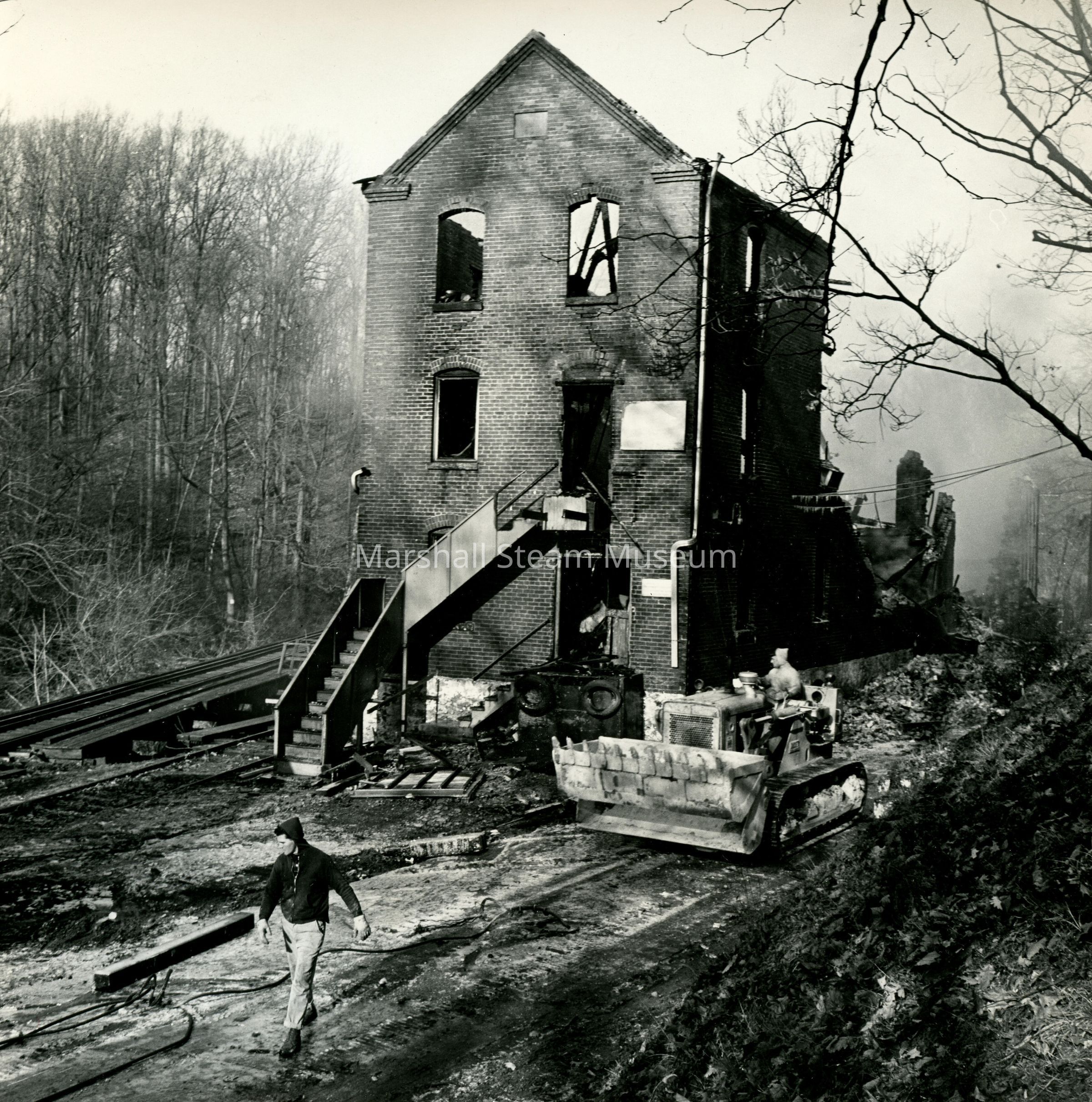 Building after fire; clean-up with dozer, December 1964 or early January 1965Photograph Details