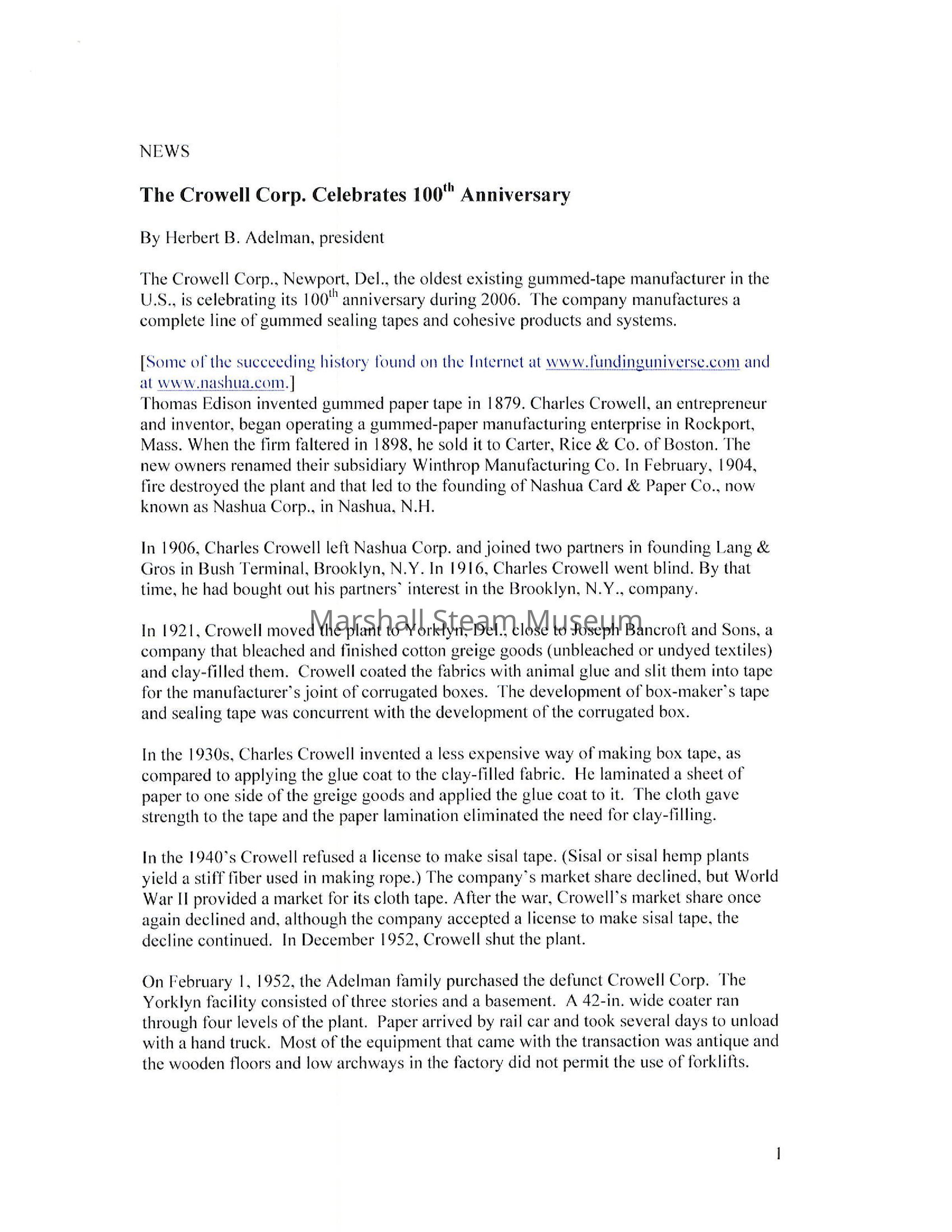 Press release announcing the 100th anniversary of Crowell Tape with a detailed history, 2006Entry/Object ID