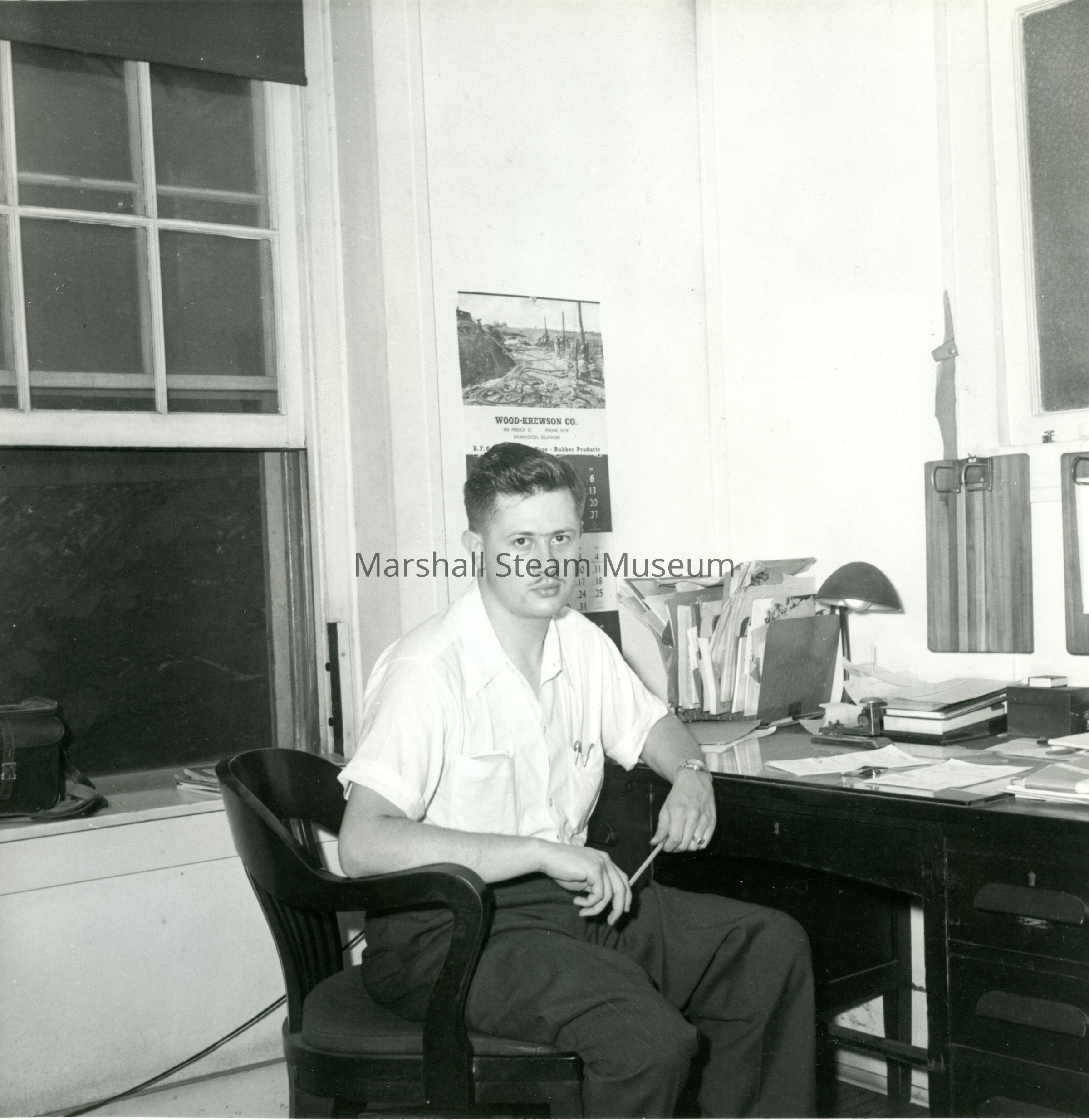 Herb Adelman, president of Crowell Tape Company at desk, 1953Entry/Object ID