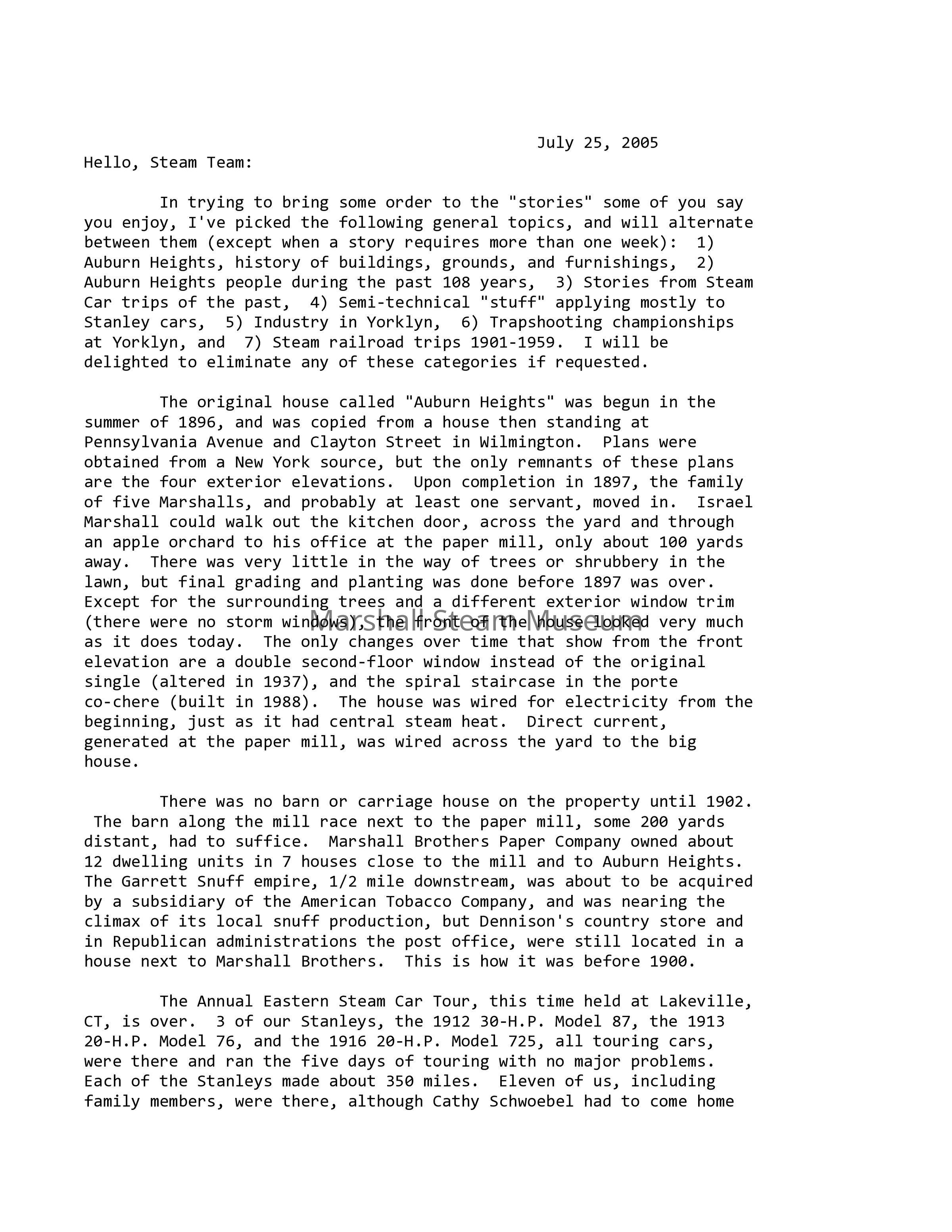 In trying to bring some order to the "stories" some of you say you enjoy, I've picked the following general topics, and will alternate between them (except when a story requires more than one week): 1) Auburn Heights, history of buildings, grounds, and furnishings, 2) Auburn Heights people during the past 108 years, 3) Stories from Steam Car trips of the past, 4) Semi-technical "stuff" applying mostly to Stanley cars, 5) Industry in Yorklyn, 6) Trapshooting championships at Yorklyn, and 7) Steam railroad trips 1901-1959. I will be delighted to eliminate any of these categories if requested.