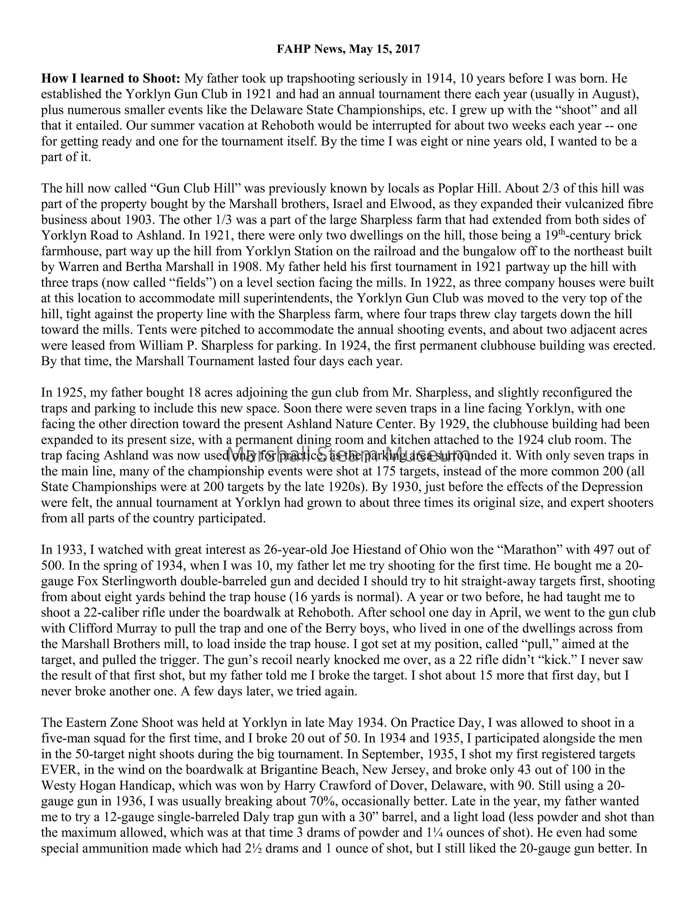 How I learned to Shoot: My father took up trapshooting seriously in 1914, 10 years before I was born. He established the Yorklyn Gun Club in 1921 and had an annual tournament there each year (usually in August), plus numerous smaller events like the Delaware State Championships, etc. I grew up with the “shoot” and all that it entailed. Our summer vacation at Rehoboth would be interrupted for about two weeks each year -- one for getting ready and one for the tournament itself. By the time I was eight or nine years old, I wanted to be a part of it.