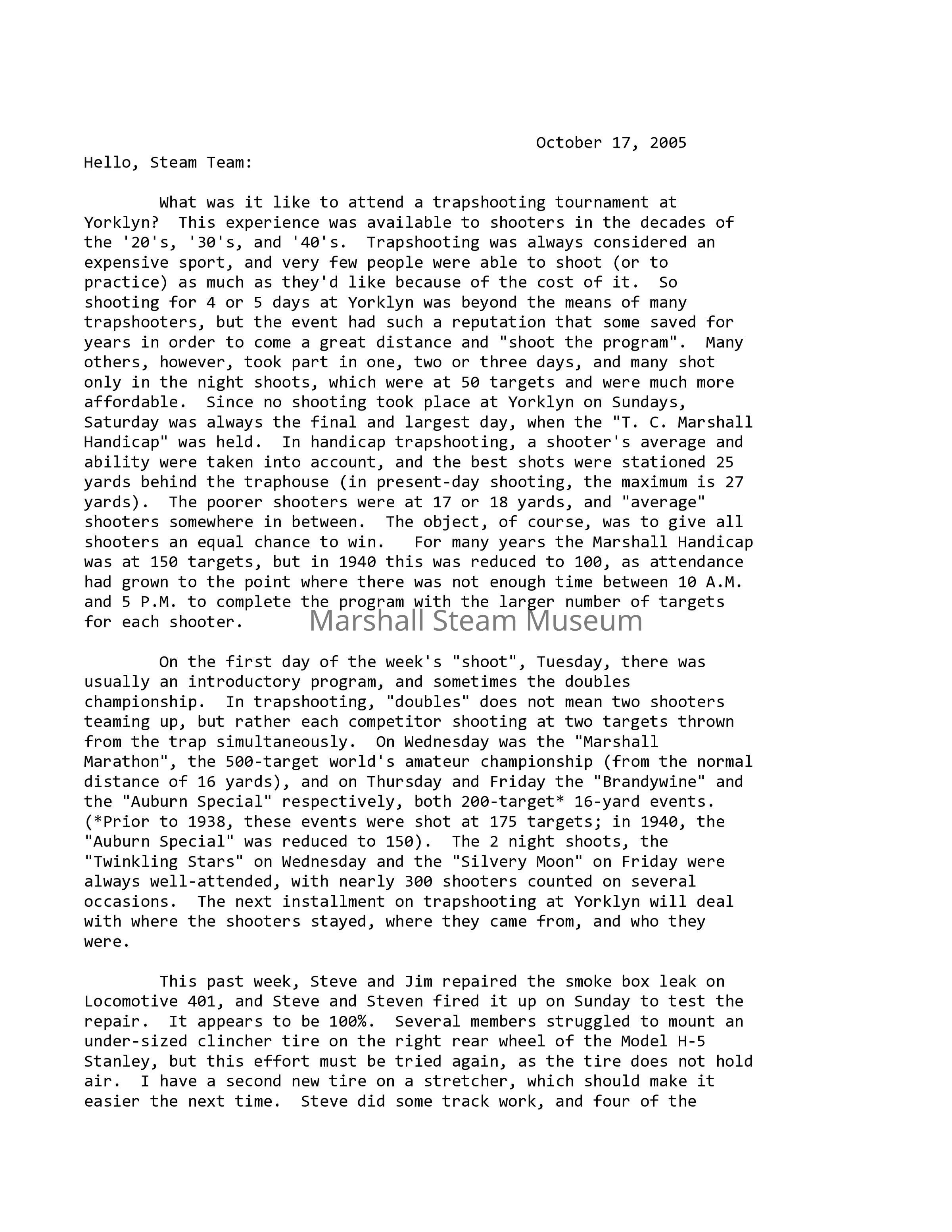 This past week, Steve and Jim repaired the smoke box leak on Locomotive 401, and Steve and Steven fired it up on Sunday to test the repair. It appears to be 100%. Several members struggled to mount an under-sized clincher tire on the right rear wheel of the Model H-5 Stanley, but this effort must be tried again, as the tire does not hold air. I have a second new tire on a stretcher, which should make it easier the next time. Steve did some track work, and four of the insulated sections are now in place preparing for our R.R. signals project. We prepared 5 cars to go to either Newtown Square on Saturday or the HCCP Fall Meet on Sunday. Saturday's event was postponed at the last minute, and is rescheduled for this coming Saturday, October 22. Four Stanleys started on Sunday, and three made the 50-mile round-trip successfully: Bill Schwoebel and Anne Cleary in the 1905 Model CX, Jerry Lucas in the '13 Model 78 roadster, and Butch Cannard and Emil Christofano in the '13 Model 76 touring. The fourth car, the '08 Model K, was doing fine but its operator was not, and he turned around 10 miles from home. His excuse was that he couldn't keep his cap on (the wind and no windshield) and couldn't turn it around as he was blinded without a visor. The museum at Newtown Square would still like us to have at least one Stanley there on 10/22, so please let Bill Schwoebel or me know if you can go. They want us there quite early, but will be glad to have us arrive as late as 10:30 or 11:00 A.M.
