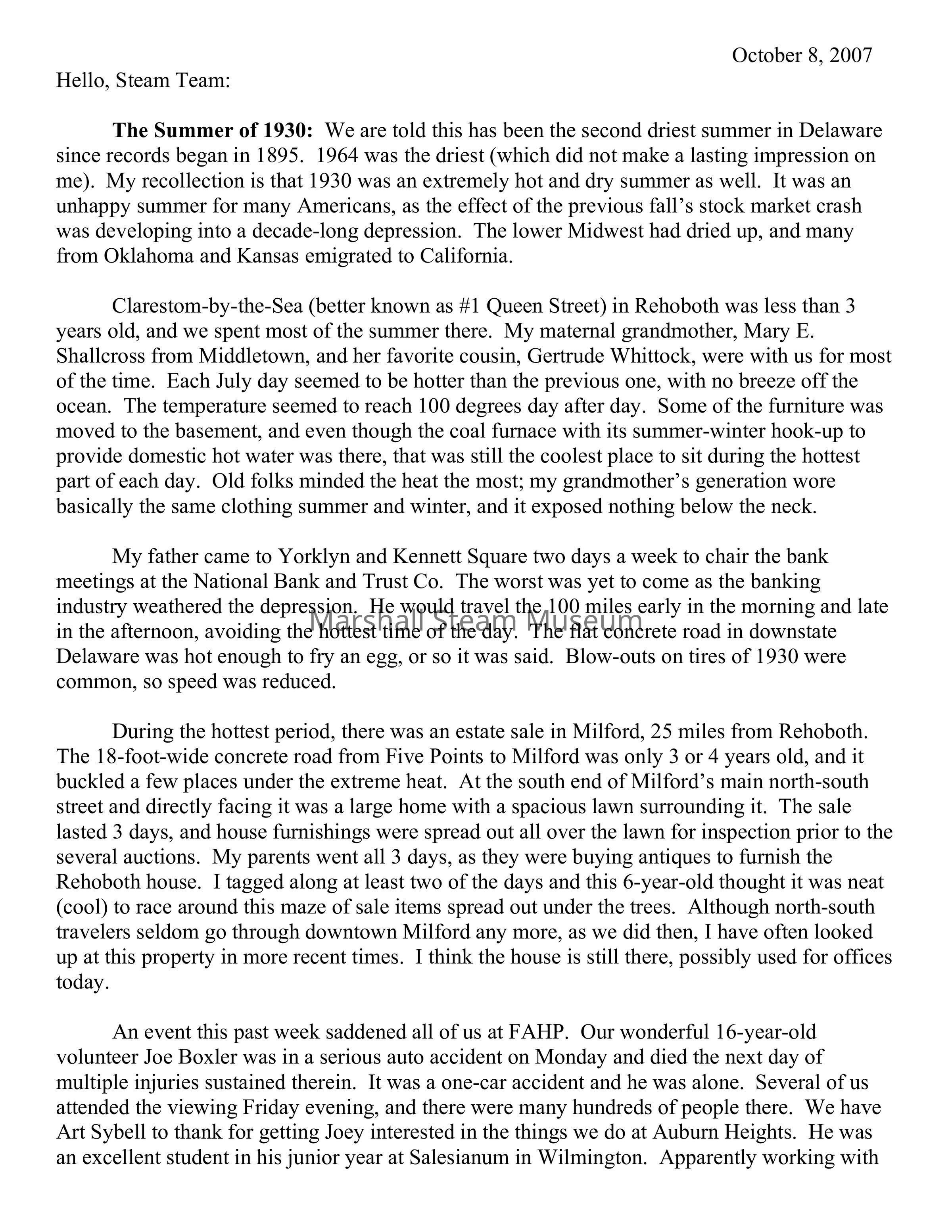 During the hottest period, there was an estate sale in Milford, 25 miles from Rehoboth. The 18-foot-wide concrete road from Five Points to Milford was only 3 or 4 years old, and it buckled a few places under the extreme heat. At the south end of Milford’s main north-south street and directly facing it was a large home with a spacious lawn surrounding it. The sale lasted 3 days, and house furnishings were spread out all over the lawn for inspection prior to the several auctions. My parents went all 3 days, as they were buying antiques to furnish the Rehoboth house. I tagged along at least two of the days and this 6-year-old thought it was neat (cool) to race around this maze of sale items spread out under the trees. Although north-south travelers seldom go through downtown Milford any more, as we did then, I have often looked up at this property in more recent times. I think the house is still there, possibly used for offices today.