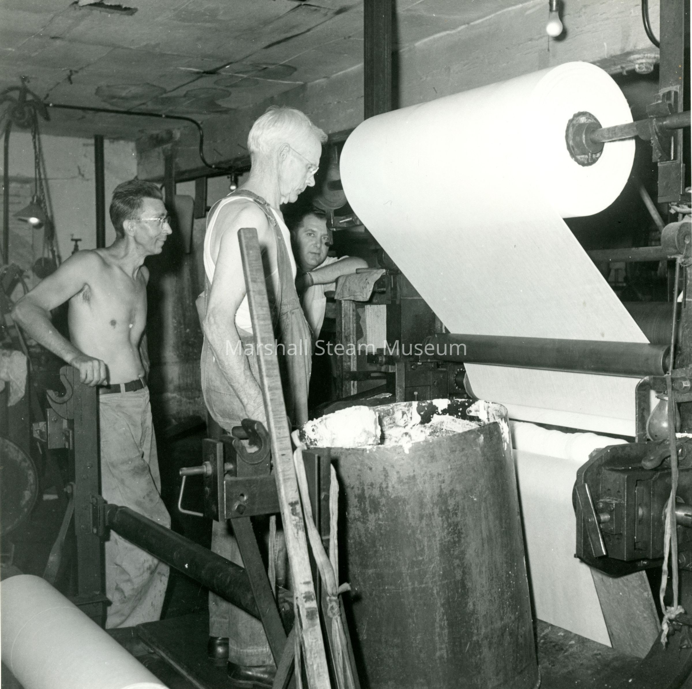 Lew Ravilious (left) and Parker Baldwin (center) operating the cloth to paper laminator adding white coatingPhotograph Details
