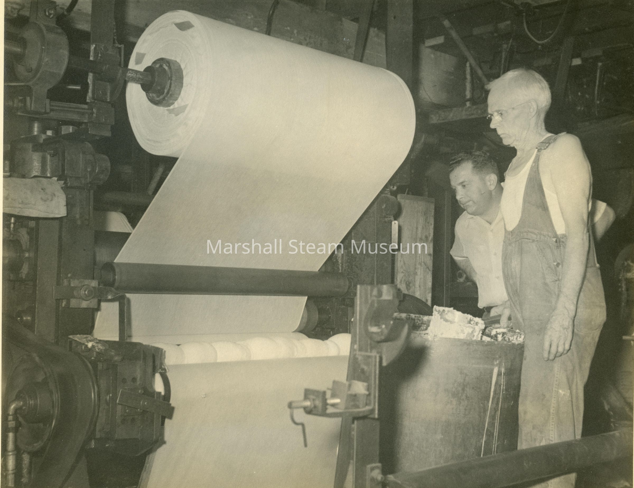 Unknown colleague (left) and Parker Baldwin (right) operating the Crowell Tape Mill laminatorPhotograph Details