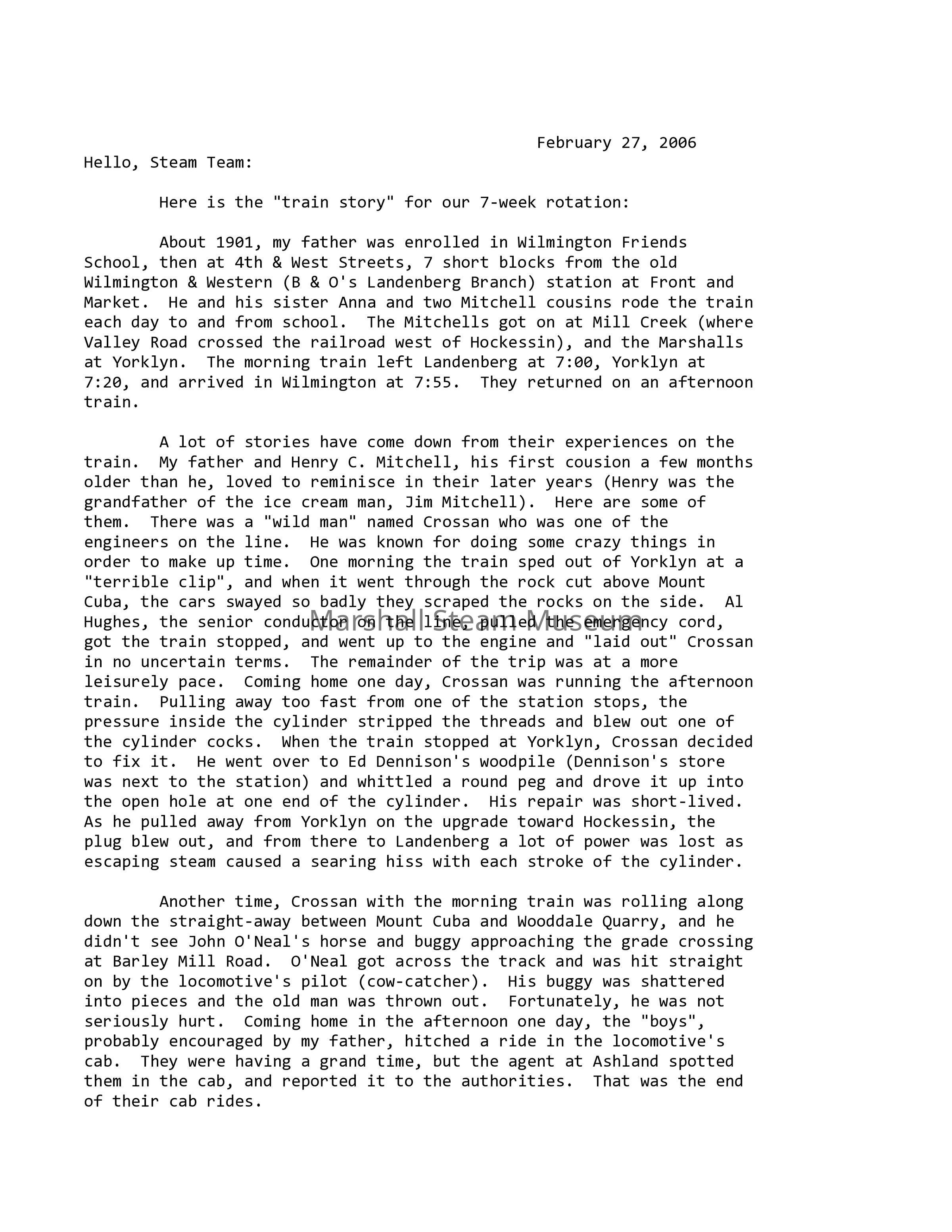 About 1901, my father was enrolled in Wilmington Friends School, then at 4th & West Streets, 7 short blocks from the old Wilmington & Western (B & O's Landenberg Branch) station at Front and Market. He and his sister Anna and two Mitchell cousins rode the train each day to and from school. The Mitchells got on at Mill Creek (where Valley Road crossed the railroad west of Hockessin), and the Marshalls at Yorklyn. The morning train left Landenberg at 7:00, Yorklyn at 7:20, and arrived in Wilmington at 7:55. They returned on an afternoon train.