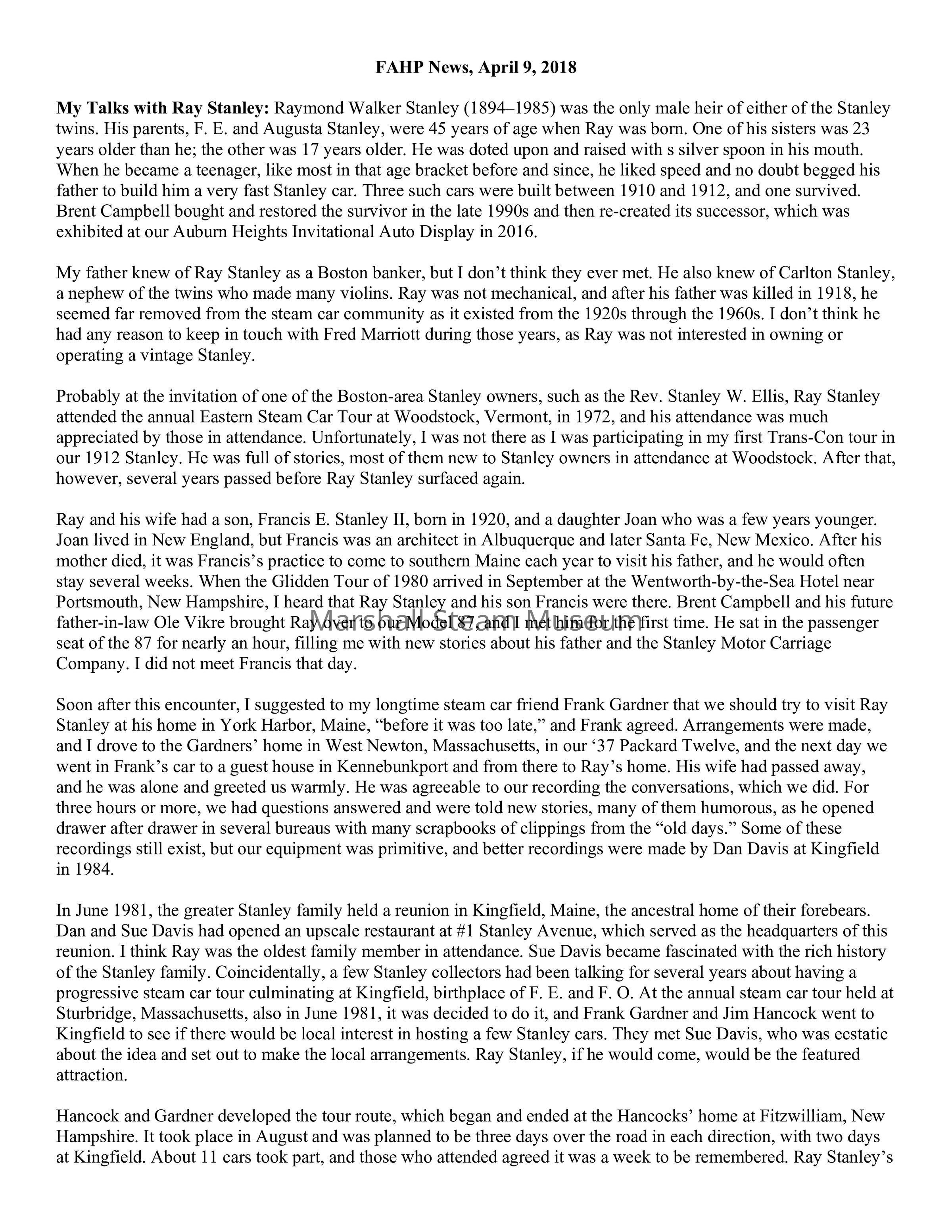 My Talks with Ray Stanley: Raymond Walker Stanley (1894–1985) was the only male heir of either of the Stanley twins. His parents, F. E. and Augusta Stanley, were 45 years of age when Ray was born. One of his sisters was 23 years older than he; the other was 17 years older. He was doted upon and raised with s silver spoon in his mouth. When he became a teenager, like most in that age bracket before and since, he liked speed and no doubt begged his father to build him a very fast Stanley car. Three such cars were built between 1910 and 1912, and one survived. Brent Campbell bought and restored the survivor in the late 1990s and then re-created its successor, which was exhibited at our Auburn Heights Invitational Auto Display in 2016.