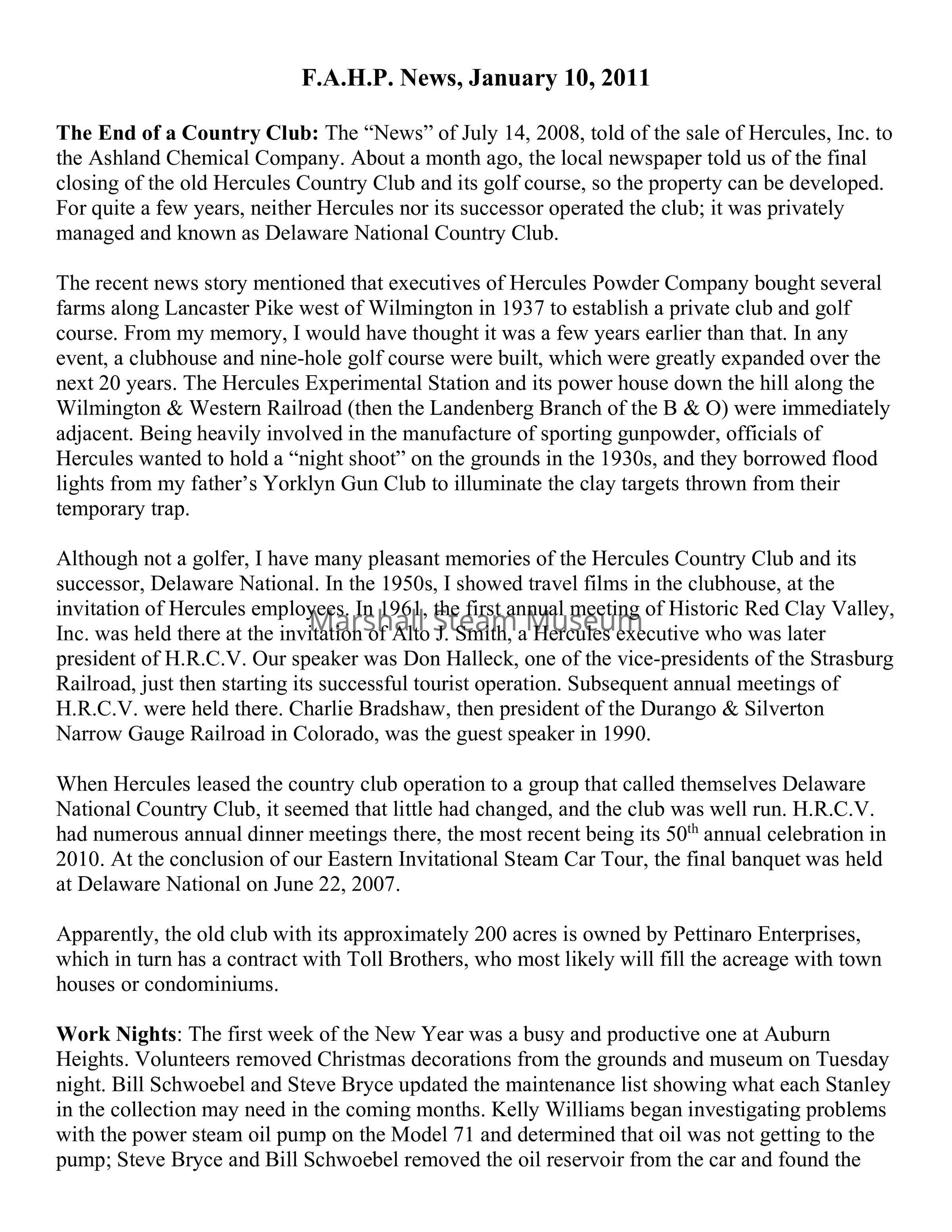 When Hercules leased the country club operation to a group that called themselves Delaware National Country Club, it seemed that little had changed, and the club was well run. H.R.C.V. had numerous annual dinner meetings there, the most recent being its 50th annual celebration in 2010. At the conclusion of our Eastern Invitational Steam Car Tour, the final banquet was held at Delaware National on June 22, 2007.