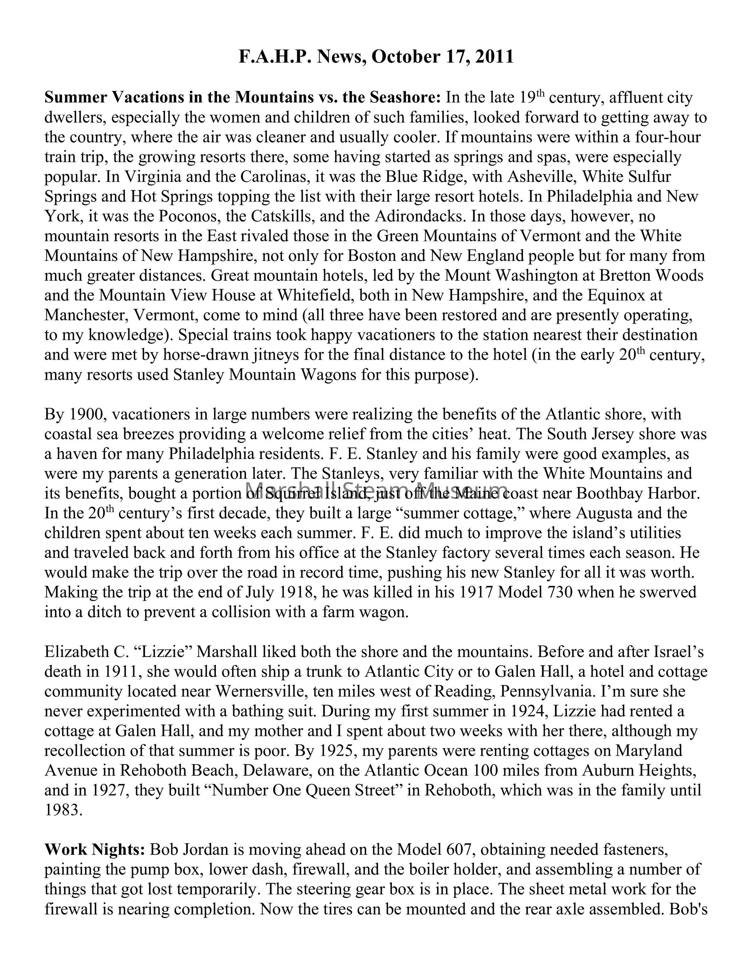 Summer Vacations in the Mountains vs. the Seashore: In the late 19th century, affluent city dwellers, especially the women and children of such families, looked forward to getting away to the country, where the air was cleaner and usually cooler. If mountains were within a four-hour train trip, the growing resorts there, some having started as springs and spas, were especially popular. In Virginia and the Carolinas, it was the Blue Ridge, with Asheville, White Sulfur Springs and Hot Springs topping the list with their large resort hotels. In Philadelphia and New York, it was the Poconos, the Catskills, and the Adirondacks. In those days, however, no mountain resorts in the East rivaled those in the Green Mountains of Vermont and the White Mountains of New Hampshire, not only for Boston and New England people but for many from much greater distances. Great mountain hotels, led by the Mount Washington at Bretton Woods and the Mountain View House at Whitefield, both in New Hampshire, and the Equinox at Manchester, Vermont, come to mind (all three have been restored and are presently operating, to my knowledge). Special trains took happy vacationers to the station nearest their destination and were met by horse-drawn jitneys for the final distance to the hotel (in the early 20th century, many resorts used Stanley Mountain Wagons for this purpose).